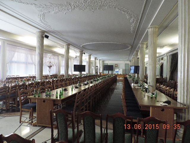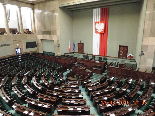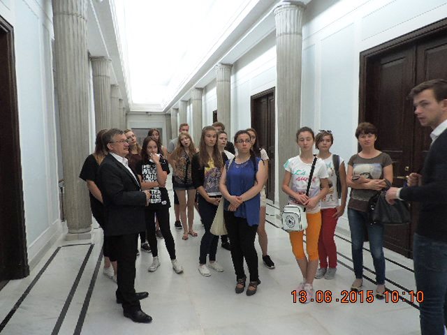 Naszym przewodnikiem podczas zwiedzania Parlamentu RP był osobiście pan Senator Jurcewicz oraz sejmowy przewodnik. Uzyskaliśmy od nich wiele ciekawych informacji, dotyczących długoletniej historii i tradycji polskiego parlamentu, który tworzą 2 Izby - Sejm i Senat. Zwiedziliśmy między innymi Salę Kolumnową, „korytarz marszałkowski" oraz Salę Posiedzeń Senatu. Sobota jest dniem, kiedy nie odbywają się posiedzenia Sejmu, dlatego udało się nam zwiedzić również hall główny, na którym znajduje się makieta kompleksu budynków sejmowych. Mogliśmy przyjrzeć się tablicy upamiętniającej posłów II Rzeczypospolitej, którzy zginęli w czasie II wojny światowej oraz tablicy upamiętniającej parlamentarzystów, którzy zginęli w katastrofie lotniczej pod Smoleńskiem. Obejrzeliśmy także gablotę z laskami marszałkowskimi. Młodzież wykazała się sporą wiedzą, a nawet na Sali Senatu „rozgorzała” dyskusja...