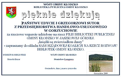 Za pieniądze z programu Infrastruktura Bibliotek, ze środków finansowych Ministerstwa Kultury i Dziedzictwa Narodowego, pochodzące z budżetu państwa, w minionym roku Biblioteka Publiczna Gminy Kłodzko zrealizowała trzy zadania. Prace adaptacyjno-remontowe przeprowadzono w części parterowej w budynku po byłej szkole podstawowej w Jaszkowej Górnej, gdzie swoją nową siedzibę znalazła Filia Biblioteki przeniesiona z Domu Ludowego. Obecnie przy bibliotece organizowana jest pracownia komputerowa z 10 stanowiskami. W Filii w Wojborzu zostały wykonane prace remontowe w czytelni; wymieniono podłogę, stolarkę okienną i drzwiową, odgrzybiono i pomalowano ściany oraz sufity. Natomiast w Filii w Żelaźnie wymieniono podłogi i okna, pomalowano pomieszczenia. Wartość wszystkich robót zamknęła się kwotą 133 196, 72 złotych, w tym kwota 70 000 złotych pochodzi z budżetu państwa. Dzięki temu poprawiła się estetyka i wizerunek wnętrz, zapewniono klientom dogodne warunki do korzystania z usług bibliotecznych, jak również przystąpiono do budowania nowej i atrakcyjnej oferty dla czytelników.