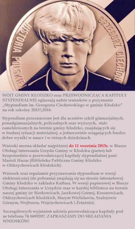 Wójt Gminy Kłodzko oraz Przewodnicząca Kapituły Stypendialnej ogłaszają nabór wniosków o przyznanie „Stypendium im. Grzegorza Ciechowskiego w gminie Kłodzko”. Stypendium przeznaczone jest dla uczniów szkół gimnazjalnych, ponadgimnazjalnych, policealnych oraz wyższych, stale zameldowanych na terenie gminy Kłodzko, znajdujących się w trudnej sytuacji materialnej, a jednocześnie osiągających bardzo dobre wyniki w nauce i w różnych dziedzinach. Wnioski można składać najpóźniej do 11 września 2015r. w Biurze Obsługi Interesanta Urzędu Gminy w Kłodzku (parter) lub bezpośrednio u przewodniczącej kapituły stypendialnej pani Marioli Huzar (Biblioteka Publiczna Gminy Kłodzko w Ołdrzychowicach Kłodzkich). Wniosek oraz regulamin przyznawania stypendium w wersji elektronicznej (do pobrania) znajdują się na stronie internetowej Gminy Kłodzko w zakładce Kultura. W wersji papierowej w Biurze Obsługi Interesanta w Urzędzie oraz w każdej bibliotece na terenie naszej gminy (w Bierkowicach, Jaszkowej Górnej, Krosnowicach, Ołdrzychowicach Kłodzkich, Starym Wielisławiu, Szalejowie Górnym, Wojborzu, Wojciechowicach i Żelaźnie). Szczegółowych wyjaśnień udziela przewodnicząca kapituły pod nr telefonu 74 8689207. ZAPRASZAMY DO SKŁADANIA WNIOSKÓW!