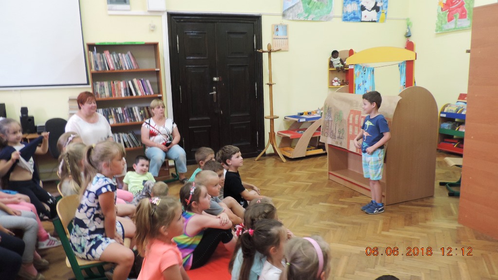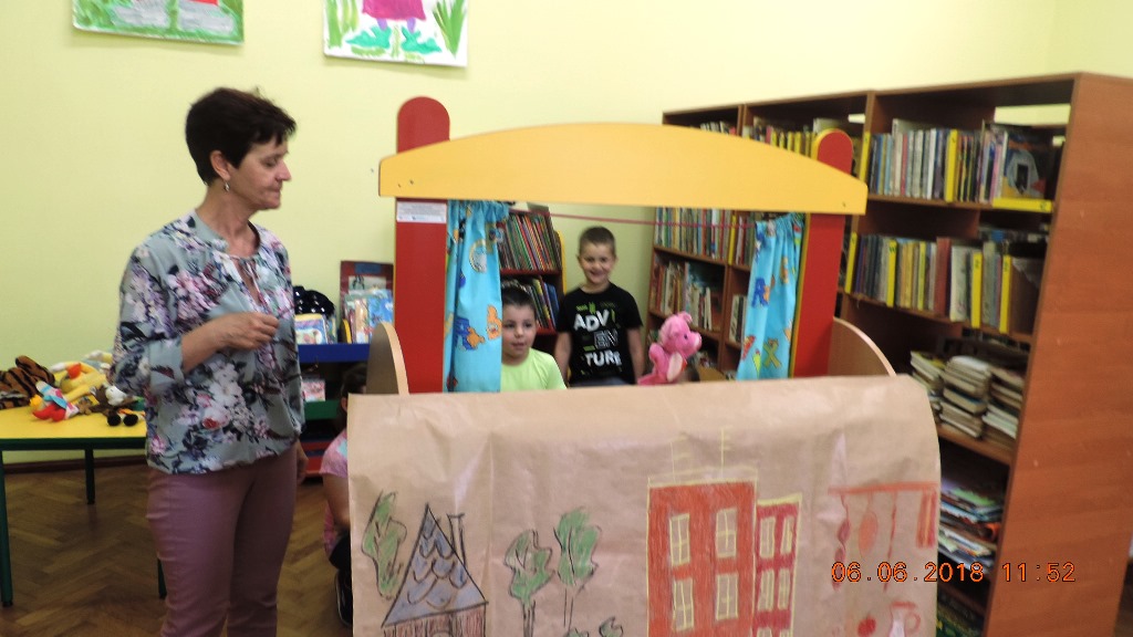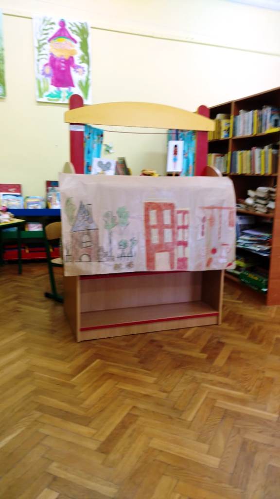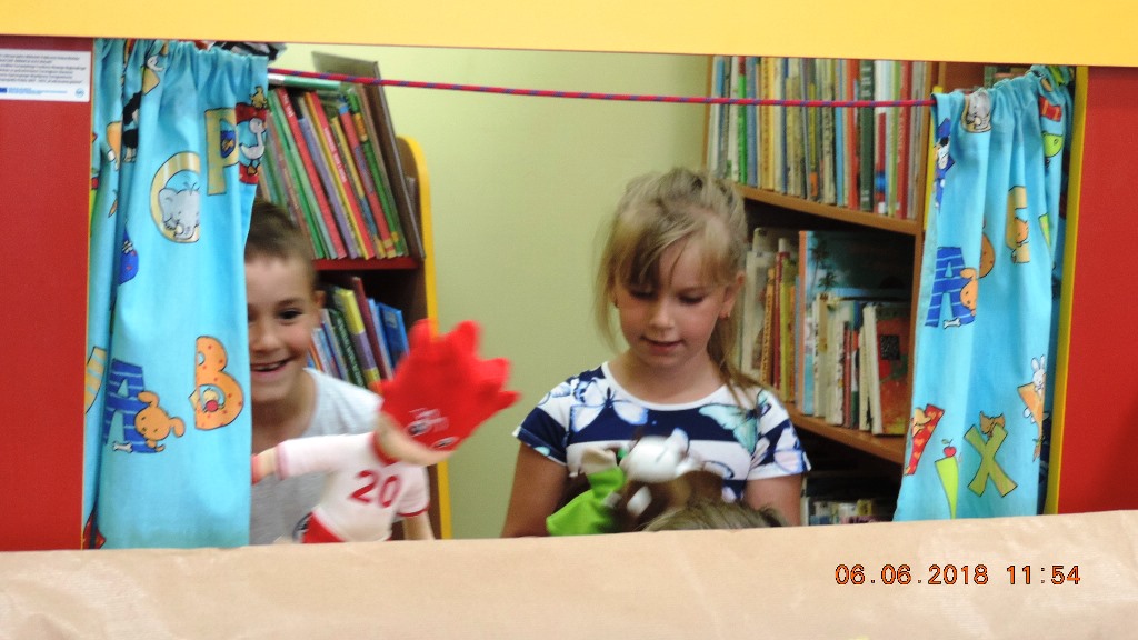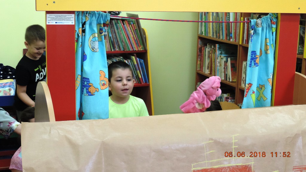 Przedszkolaki samodzielnie próbowały przedstawić dowolną scenkę za pomocą kukiełek, co widzimy na załączonych obrazkach. Zabawa w kalambury oraz pudełko zadań nie tylko bawiły, ale pomagały dzieciom zapamiętać tę ważną lekcję literacką.