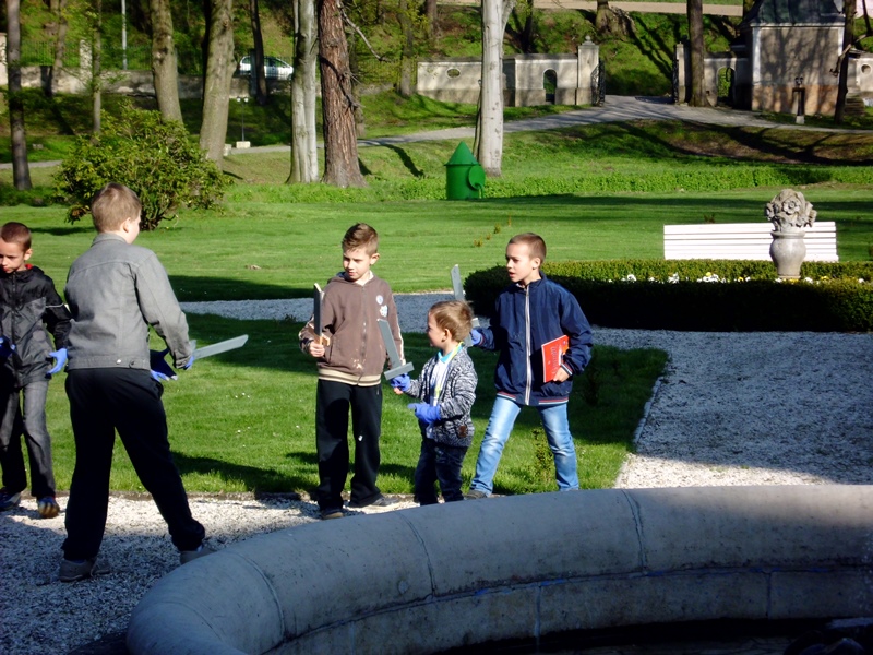 Przed pałacem dzieci mogły samodzielnie wykonać miecze z drewna. Materiał zasponsorowała Spółka „Jandar” Przerób i Handel Drewnem Braci Wolańskich w Jaszkowej Dolnej. Niestety nie dla każdego dziecka starczyło materiału. Obiecujemy, że za rok będzie więcej.