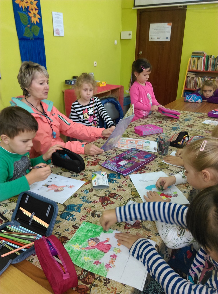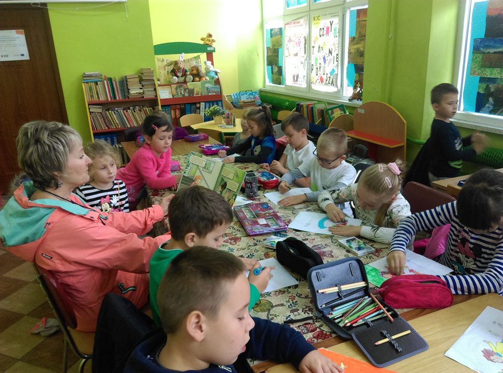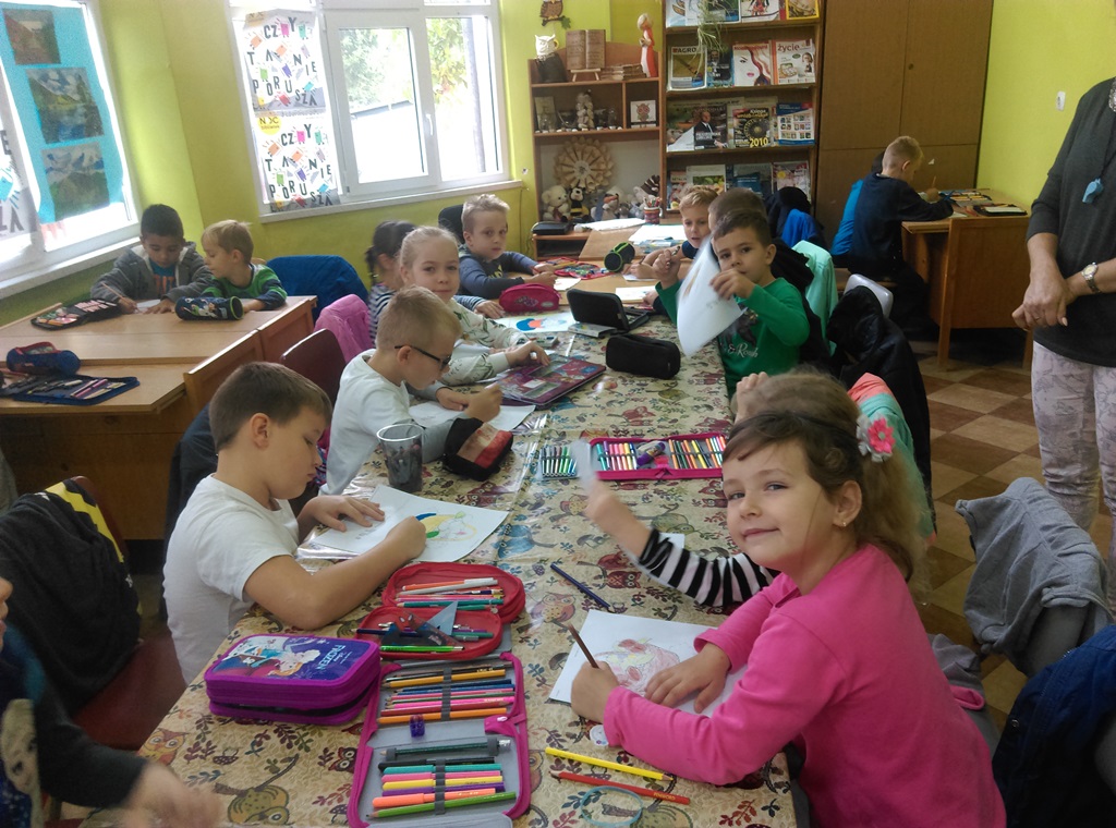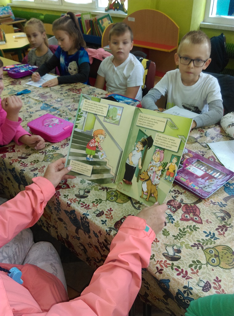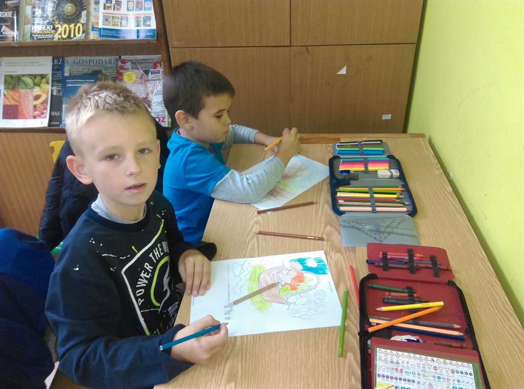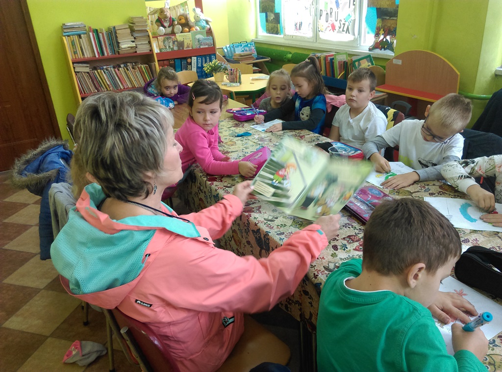 Przy tej bajce-szukajce dzieci ćwiczyły spostrzegawczość i uczyły się cierpliwości. Wierszowany tekst oraz barwne, pełne szczegółów ilustracje niewątpliwie spodobały się dzieciom, bo na zakończenie wizyty wykonały kolorowe prace plastyczne.