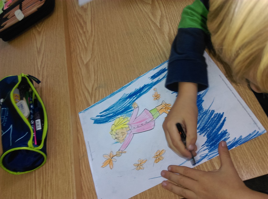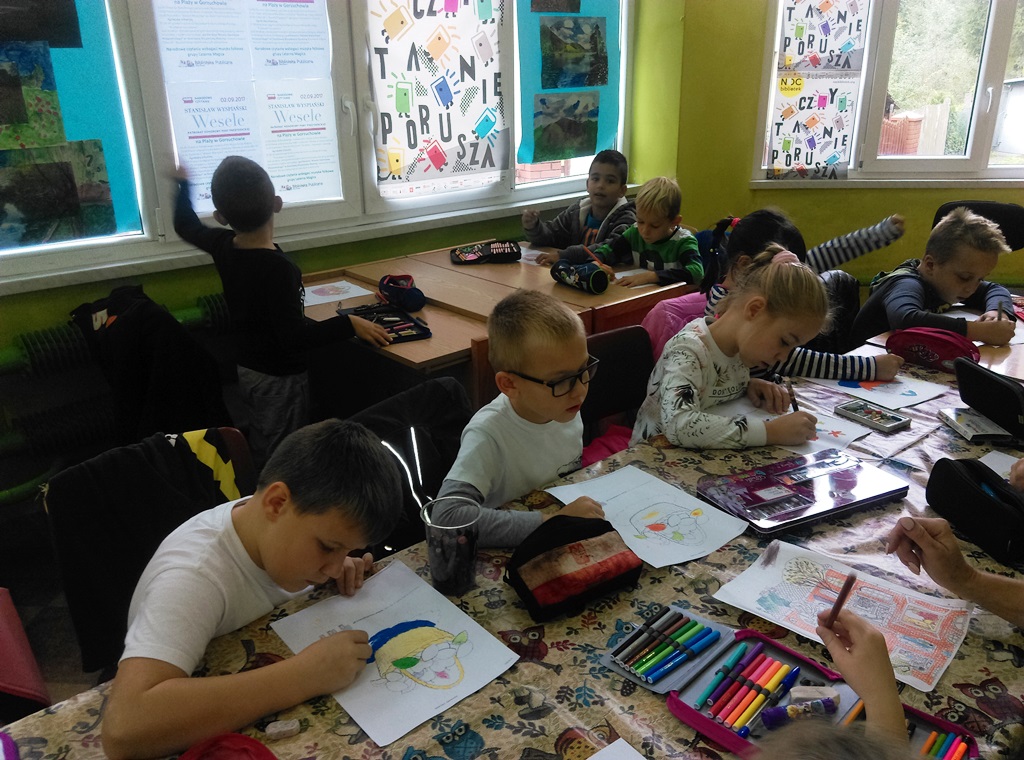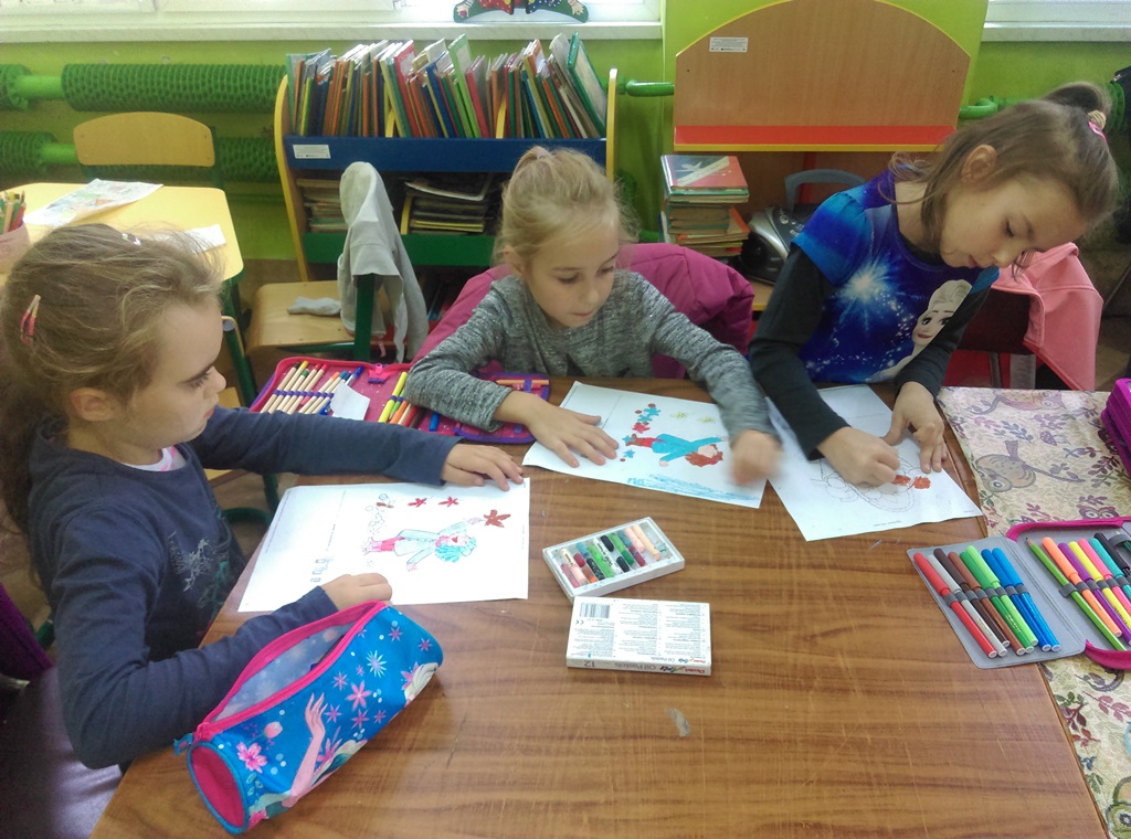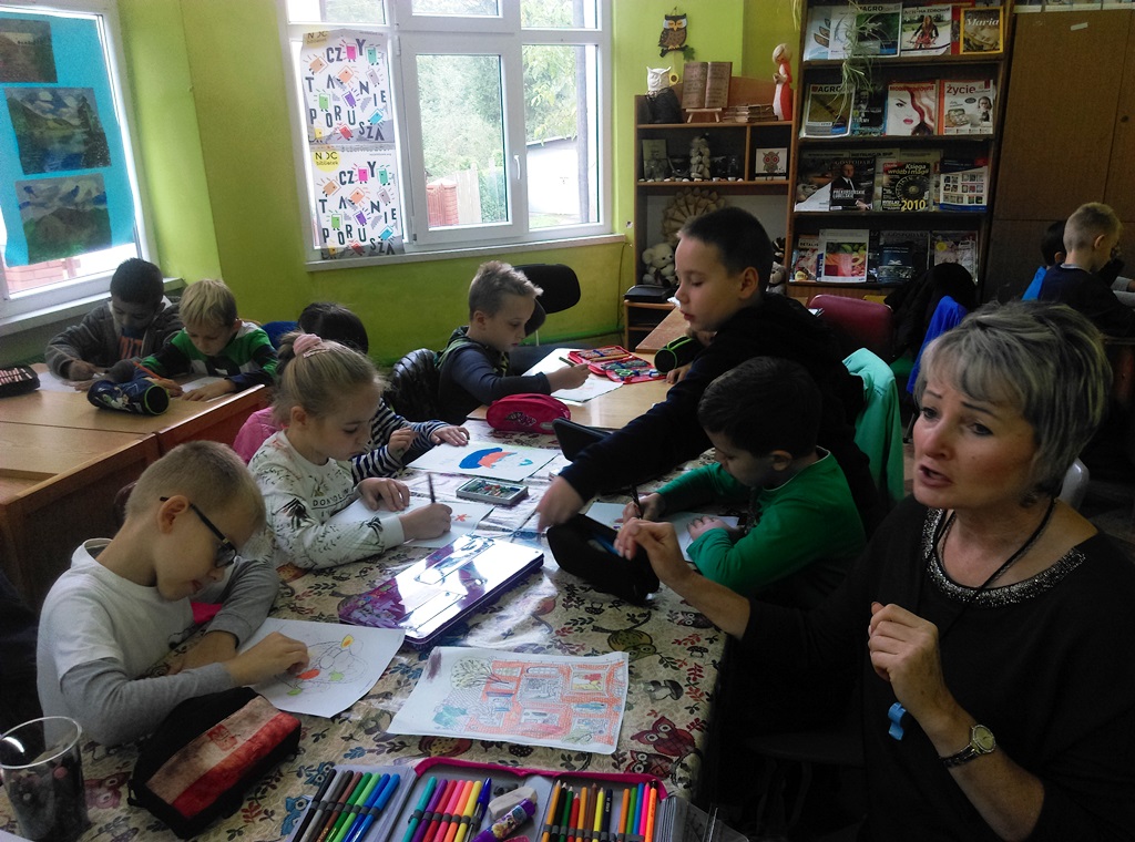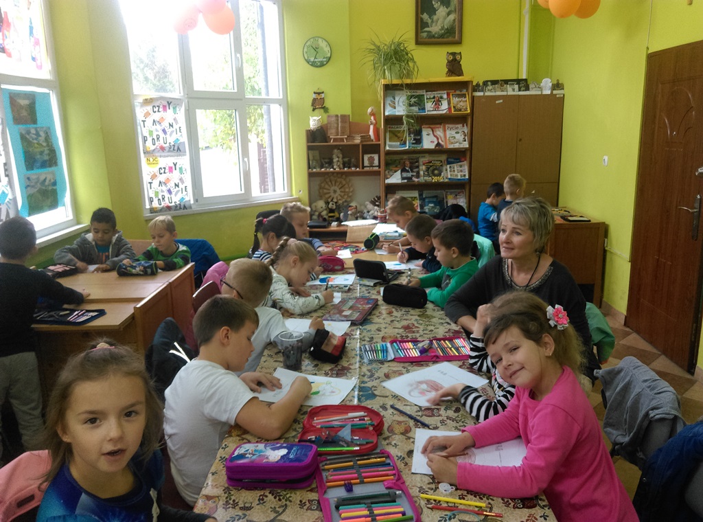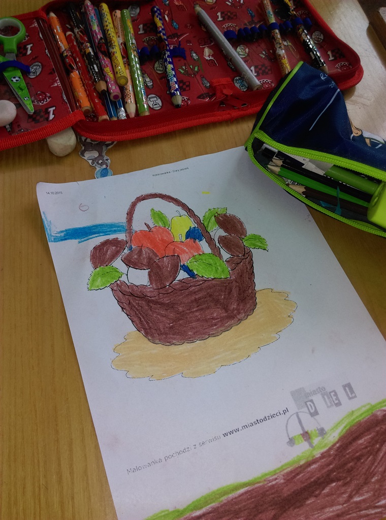 Przy tej bajce-szukajce dzieci ćwiczyły spostrzegawczość i uczyły się cierpliwości. Wierszowany tekst oraz barwne, pełne szczegółów ilustracje niewątpliwie spodobały się dzieciom, bo na zakończenie wizyty wykonały kolorowe prace plastyczne.