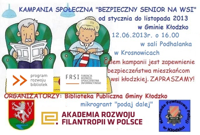 W środę 12 czerwca 2013 roku Biblioteka Publiczna Gminy Kłodzko zorganizowała trzecie już spotkanie ze swoimi bibliotekami partnerskimi z Radkowa, Ludwikowic Kłodzkich i Lewina Kłodzkiego – w sali Podhalanka w Krosnowicach. Spotkanie miało dwa cele i dwie grupy odbiorców. Edukować osoby starsze i pokazać bibliotekarzom, jak to zrobić przy udziale policjantów. Ogółem skorzystały 32 osoby.