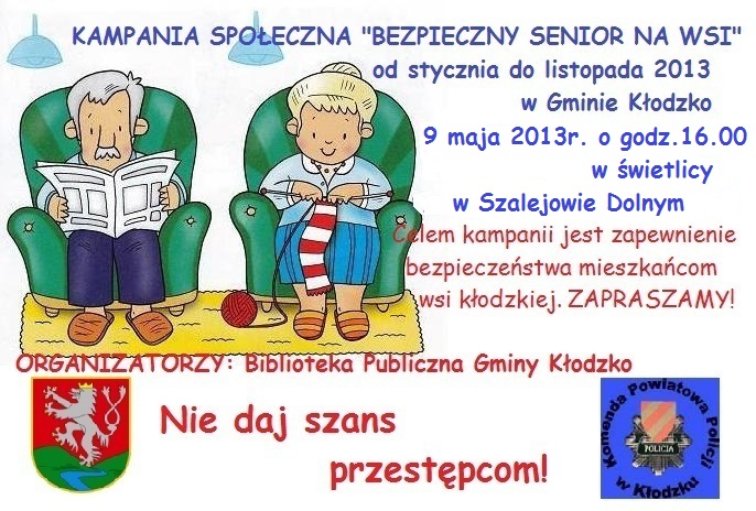 Nie tak dawno, bo w kwietniu policjanci z Komendy Powiatowej Policji w Kłodzku odwiedzili mieszkańców sołectwa Wojciechowice, w ramach realizowanej od stycznia br. w Gminie Kłodzko kampanii społecznej „Bezpieczny senior na wsi". Spotkanie zostało zorganizowane przez Bibliotekę Publiczną Gminy Kłodzko przy współpracy z tutejszym kołem gospodyń wiejskich.