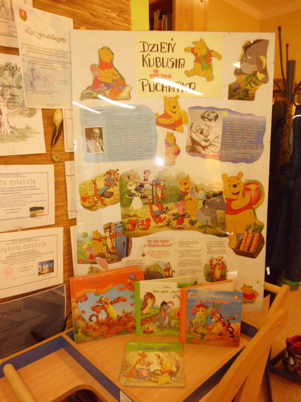Z tego też powodu, Kubuś Puchatek bywa na zajęciach bibliotecznych w Jaszkowej bardzo rozchwytywany. Bierze czynny udział w malowankach, kolorowankach i wycinankach. Doradza dziewczynkom „co i jak?” Nie tak dawno, przy jego pomocy powstał komplet postaci do kącika teatralnego. Na scenie pojawili się nowi bohaterowie w sztuce zatytułowanej „Kubuś i miodek”, według własnego scenariusza.
