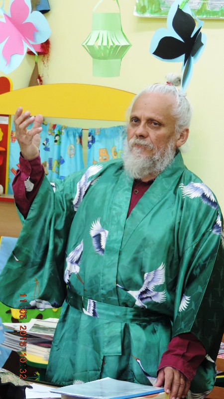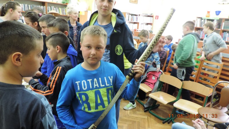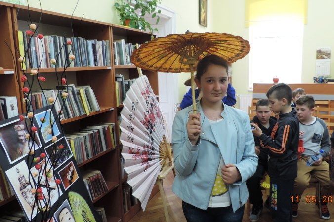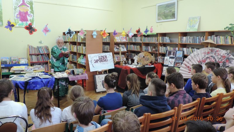 Od 11 maja biblioteka została krajem kwitnącej wiśni. Przyjechał do nas podróżnik pan Leszek Brągiel, który opowiadał o historii, kulturze i zwyczajach Japonii. Na spotkaniu pojawiło się ponad 30 uczniów z miejscowej szkoły podstawowej. Chłopcy wykazali się wiedzą na temat japońskich sztuk walki oraz samurajskich obyczajów. Dziewczęta z zainteresowaniem słuchały o japońskiej sztuce układania kwiatów oraz o celebrowaniu picia herbaty. Pracownicy biblioteki przygotowali interesującą wystawę. Na uwagę zasługują takie eksponaty jak: składany wachlarz, japońska parasolka zwana wagasa, nakrycie głowy używane na polach ryżowych, ceramika… Pan Leszek przywiózł ze sobą jeden z samurajskich mieczy, tomik wierszy zwany haiku, tkaniny ozdobne, tradycyjny zestaw do parzenia herbaty… Na zakończenie każdy z uczestników otrzymał lampion japoński, wykonany przez panią Romę Szczerbień. Każdy z lampionów został podpisany przez pana Leszka.