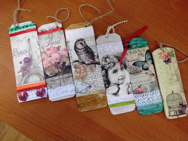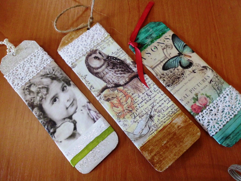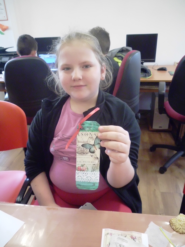 Pani Ewa, to bibliotekarka z najkrótszym stażem w sieci bibliotecznej w naszej gminie, ale za to z wielką pasją artystyczną. Podczas ogólnopolskiego tygodnia bibliotek zaserwowała swoim młodym czytelnikom przygodę z decupage w stylu retro. Początkowo było trochę trudności z opanowaniem metody pracy, ale w efekcie końcowym, powstałe zakładki do książek można śmiało określić, jako dziecięce dzieła sztuki. Instrukcja: na tekturowe szablony naklejamy serwetki oraz wybrane grafiki, pozostałe tło wykańczamy farbami, tasiemką i koronką. I gotowe! Powodzenia!