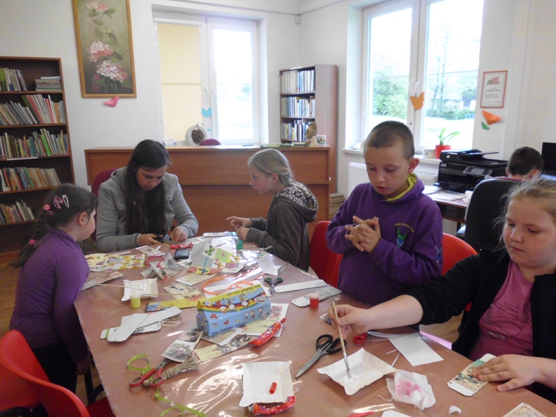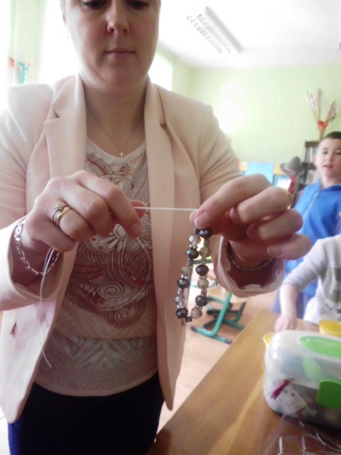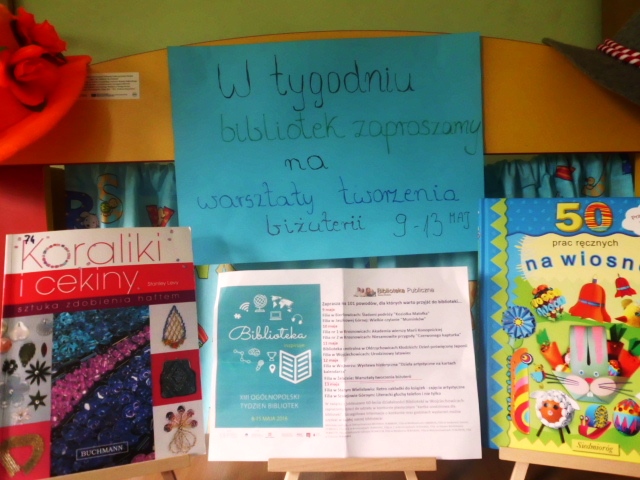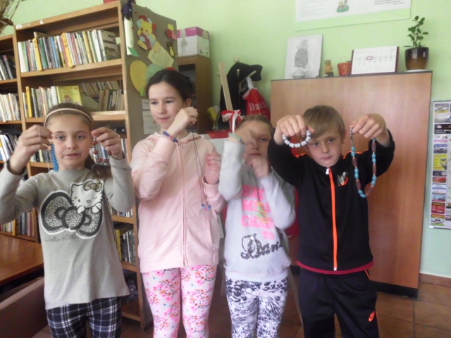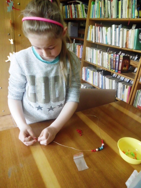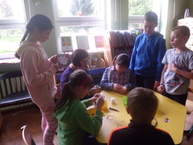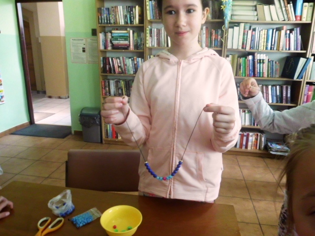 Tutejsza bibliotekarka specjalizuje się w tworzeniu biżuterii. Swoje umiejętności z chęcią przekazuje młodszemu pokoleniu. Młodzi czytelnicy przy każdej możliwej okazji wykonują bransoletki i naszyjniki, tak bardzo modne od kilku sezonów. Jest to świetna zabawa i trening manualny. Ważne podczas zajęć okazuje się poczucie estetyki i ładu przy tego typu pracy. Uczestnicy warsztatów nie myślą tylko o sobie, część z nich wykonuje ozdoby dla swoich mam (bo niebawem Dzień Matki), a zaskakujące jest to, że świetnie znają ulubione wzornictwo swoich mam. Prezent wykonany własnoręcznie przez dziecko, to dla mamy skarb o najwyższej wartości. Warsztaty uważamy za udane. Dlaczego? Bo chcemy więcej!!!