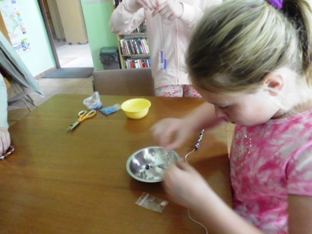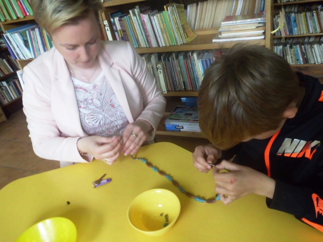 Tutejsza bibliotekarka specjalizuje się w tworzeniu biżuterii. Swoje umiejętności z chęcią przekazuje młodszemu pokoleniu. Młodzi czytelnicy przy każdej możliwej okazji wykonują bransoletki i naszyjniki, tak bardzo modne od kilku sezonów. Jest to świetna zabawa i trening manualny. Ważne podczas zajęć okazuje się poczucie estetyki i ładu przy tego typu pracy. Uczestnicy warsztatów nie myślą tylko o sobie, część z nich wykonuje ozdoby dla swoich mam (bo niebawem Dzień Matki), a zaskakujące jest to, że świetnie znają ulubione wzornictwo swoich mam. Prezent wykonany własnoręcznie przez dziecko, to dla mamy skarb o najwyższej wartości. Warsztaty uważamy za udane. Dlaczego? Bo chcemy więcej!!!