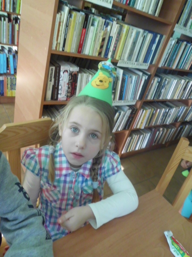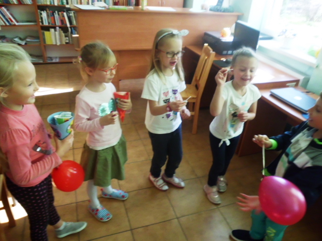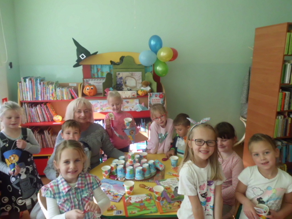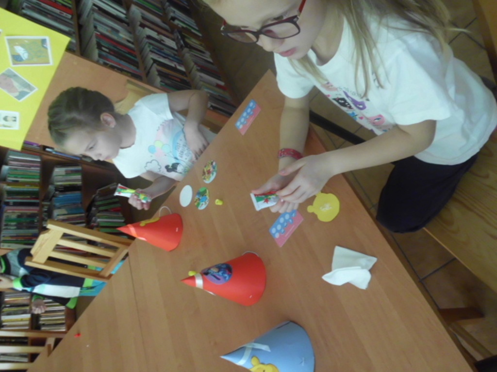 Niespodzianką był tort zrobiony z kolorowych kubeczków, pod którymi czekały na dzieci słodkie niespodzianki oraz balony. I zaczęła się nauka samodzielnego nadmuchiwania balonu. Było przy tym dużo śmiechu, zabawy, pozytywnego myślenia, że nie ma sytuacji bez wyjścia i rzeczy niemożliwych do zrobienia. Jedno jest pewne wszyscy znamy i kochamy tego zabawnego misia oraz wszystkich bohaterów Stumilowego lasu. Żal było wracać do swoich zajęć, ale przecież jeszcze nie raz spotkamy się w bibliotece.