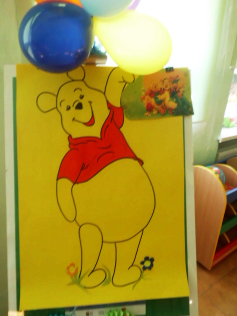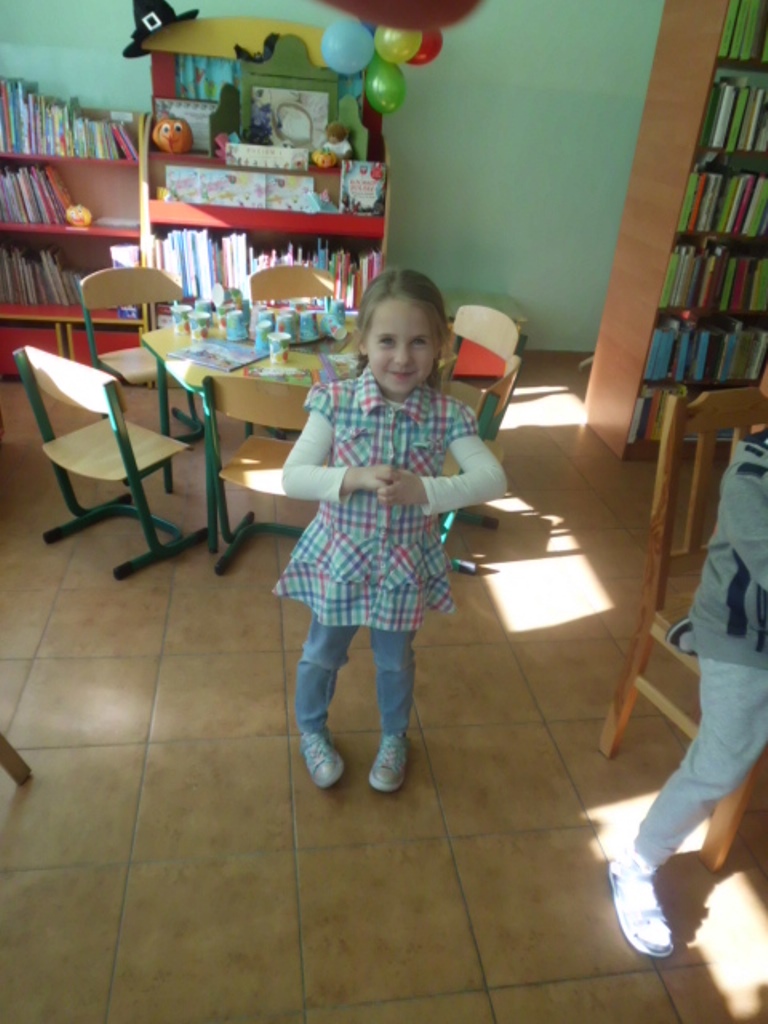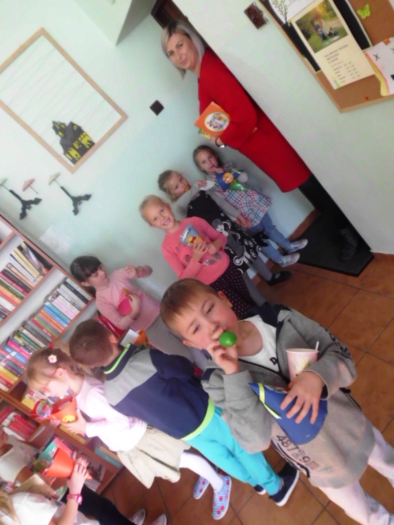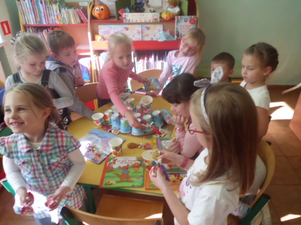 Niespodzianką był tort zrobiony z kolorowych kubeczków, pod którymi czekały na dzieci słodkie niespodzianki oraz balony. I zaczęła się nauka samodzielnego nadmuchiwania balonu. Było przy tym dużo śmiechu, zabawy, pozytywnego myślenia, że nie ma sytuacji bez wyjścia i rzeczy niemożliwych do zrobienia. Jedno jest pewne wszyscy znamy i kochamy tego zabawnego misia oraz wszystkich bohaterów Stumilowego lasu. Żal było wracać do swoich zajęć, ale przecież jeszcze nie raz spotkamy się w bibliotece.