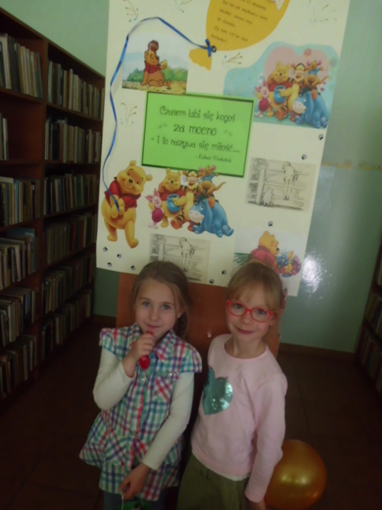 Pani bibliotekarka Roma zaplanowała świąteczny dzień, z okazji pierwszego wydania książki z przygodami Kubusia Puchatka, a było to 14 października 1926 r, czyli bardzo dawno. Oprócz Puchatka na jej kartkach możemy spotkać jeszcze Prosiaczka, Królika, Kłapouchego, Sowę Przemądrzałą, Mamę Kangurzycę z Maleństwem oraz Krzysia. Krzyś to po prostu syn autora- Christopher Robin Milne, a Kubuś Puchatek to jego ulubiona zabawka.