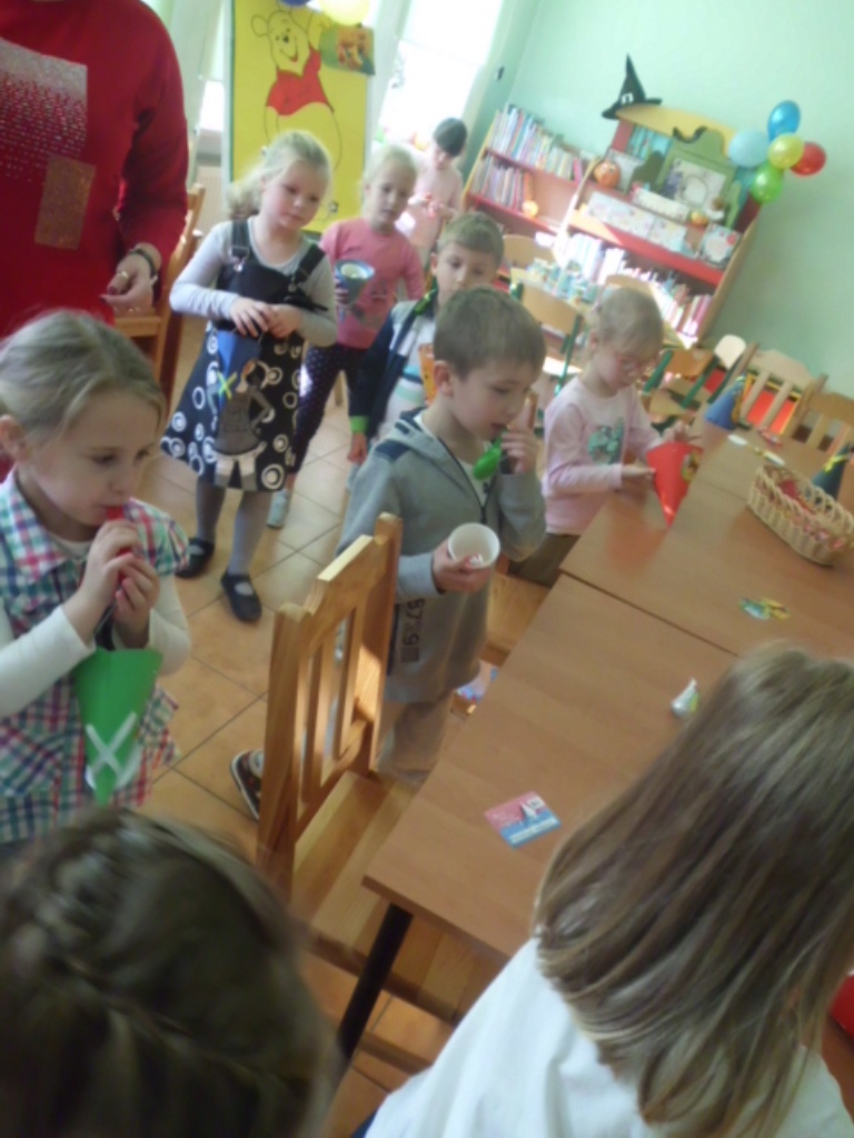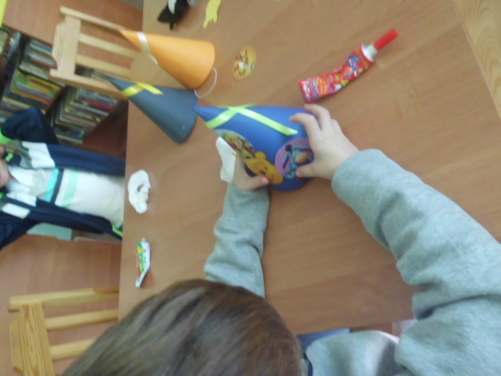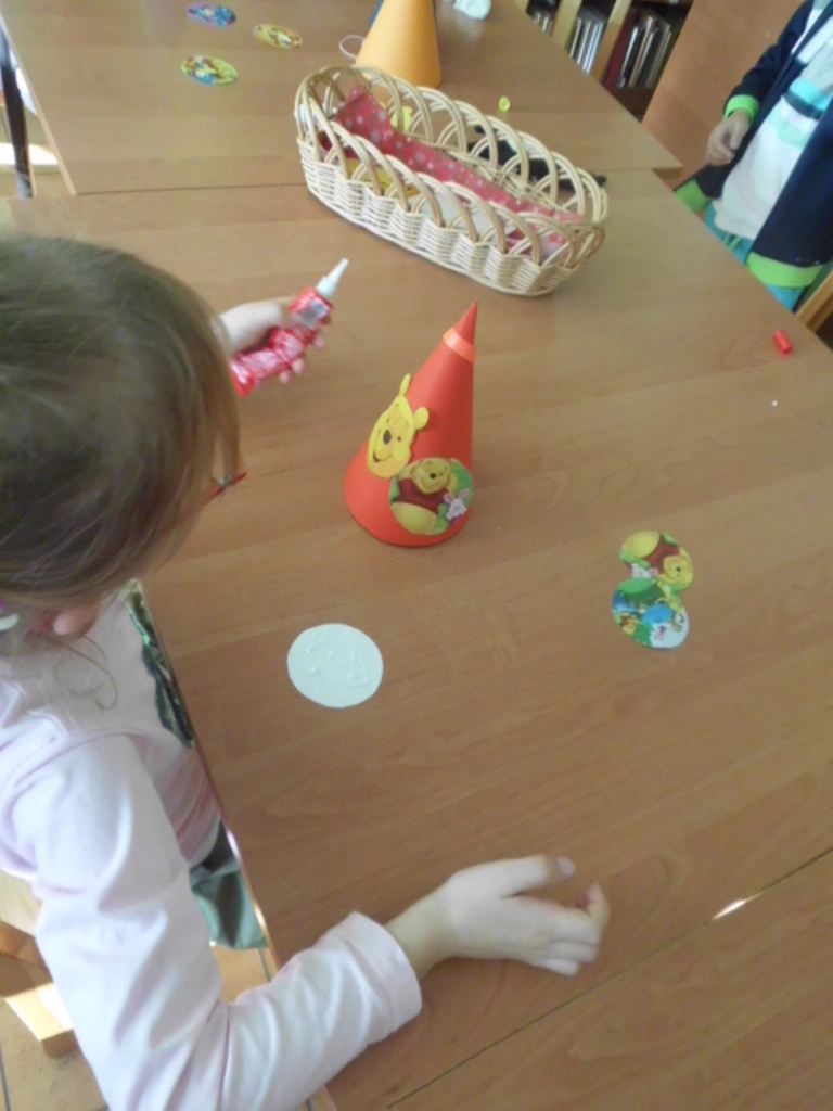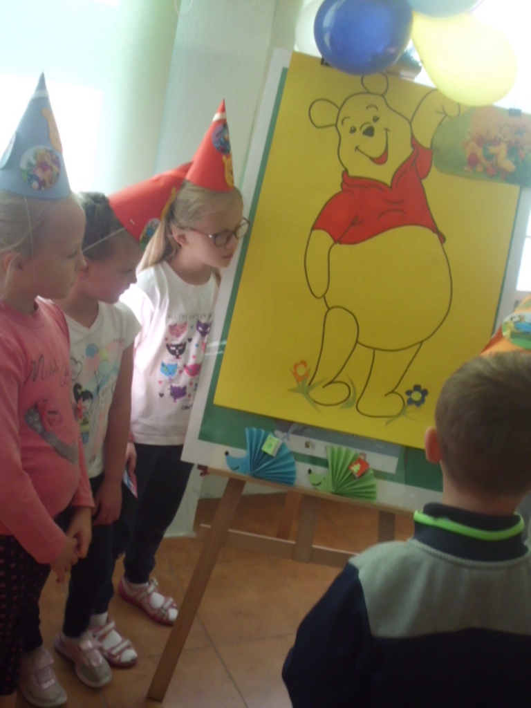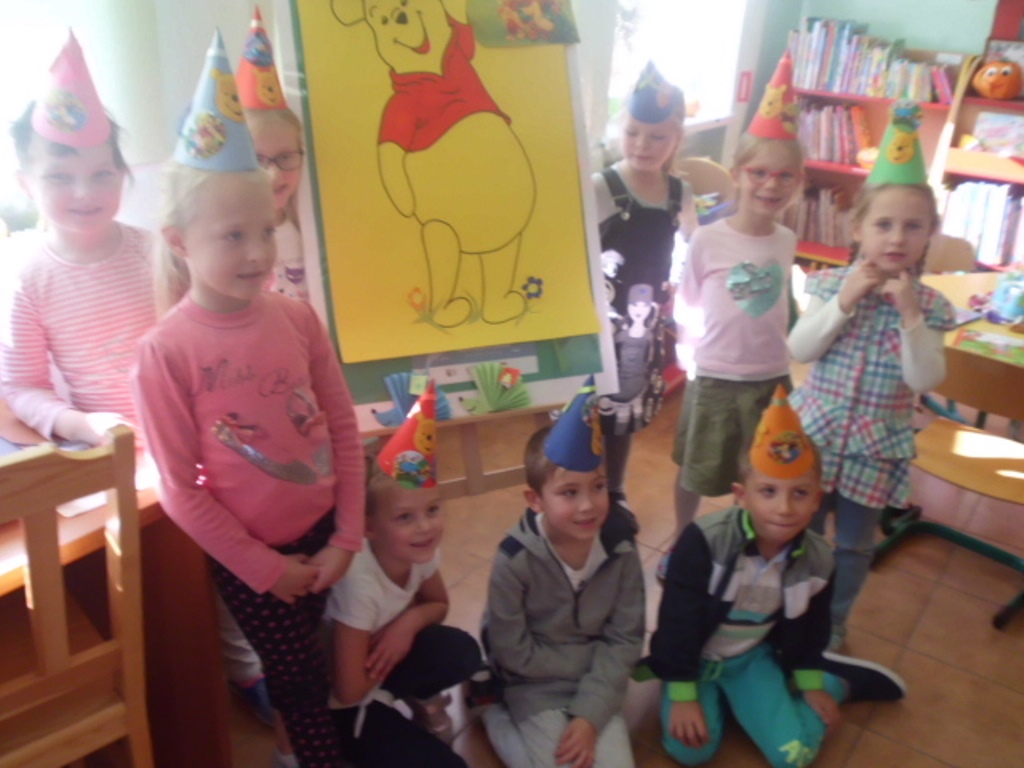 Na zakończenie miodowej lekcji odbyła się „Zgaduj-zgadula”, zabawa ruchowa w naśladownictwo mieszkańców Stumilowego lasu oraz kreatywne zajęcia, czyli wykonanie czapeczek potrzebnych do świętowania. Nie obyło się bez pozowania do pamiątkowych zdjęć, oczywiście w nakryciach głowy.