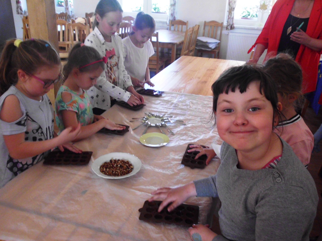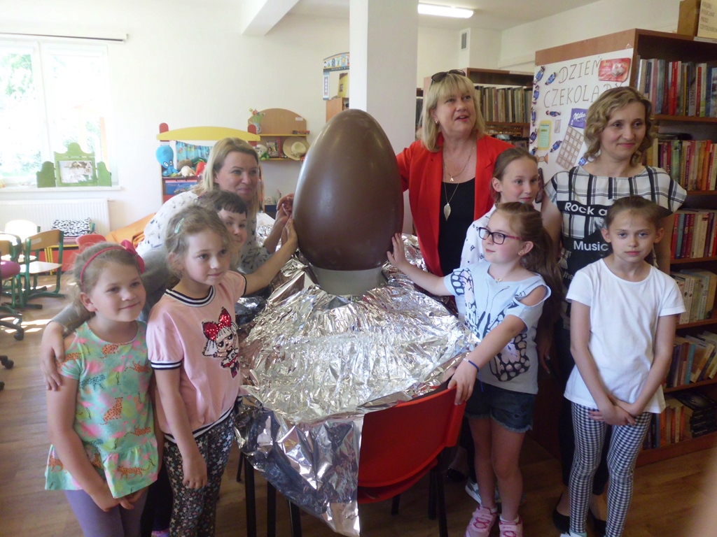 Nie ma takiego czytelnika w bibliotece, który pochłonąłby sam całe to czekoladowe jajo… Dlatego też pani Ewa postanowiła się nim podzielić. Jajo zostało spożytkowane na kilka sposobów. Na gorąco rozpływało się w ustach… Na zimno smakowało znajomo… Z pomocą pani świetlicowej Halinki powstały czekoladki kuleczki…