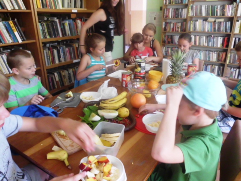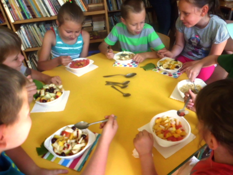 W jednym zdaniu można powiedzieć, że była to wakacyjna biblioteka z książką, Kubusiem Puchatkiem i kuchcikowem. Więcej… Na zajęciach młodzi czytelnicy zajmowali się tworzeniem własnego miśka, rebusami, quizami i zagadkami. Największym powodzeniem cieszyło się kuchcikowo z łasuchami. Pyszne sałatki owocowe znikały w mgnieniu oka. Jak się okazuje, to nie tylko Kubuś Puchatek zasługuje na miano łakomczucha. Skąd my to wszyscy znamy? Z własnego kuchcikowa. Tegoroczne lato sprzyjało również propagowaniu czytelnictwa na świeżym powietrzu. „Czytanie nie zna granic”.