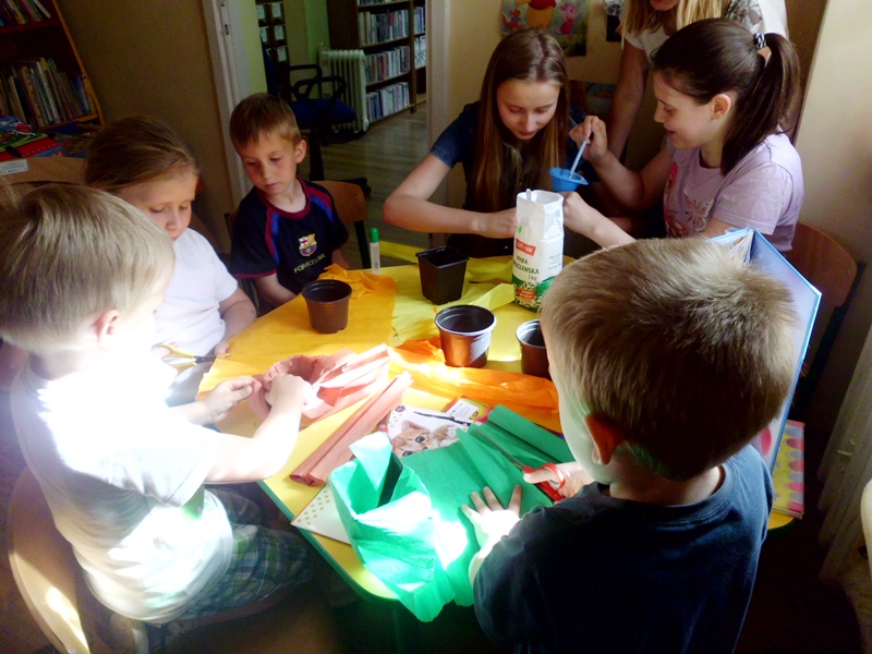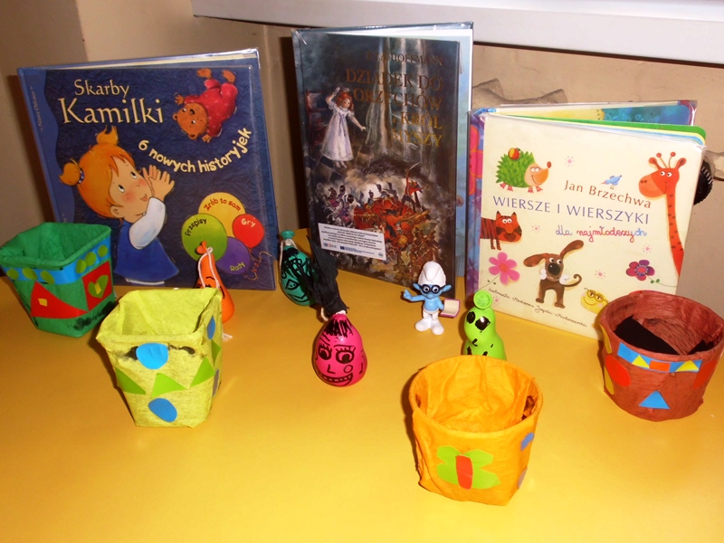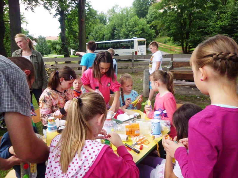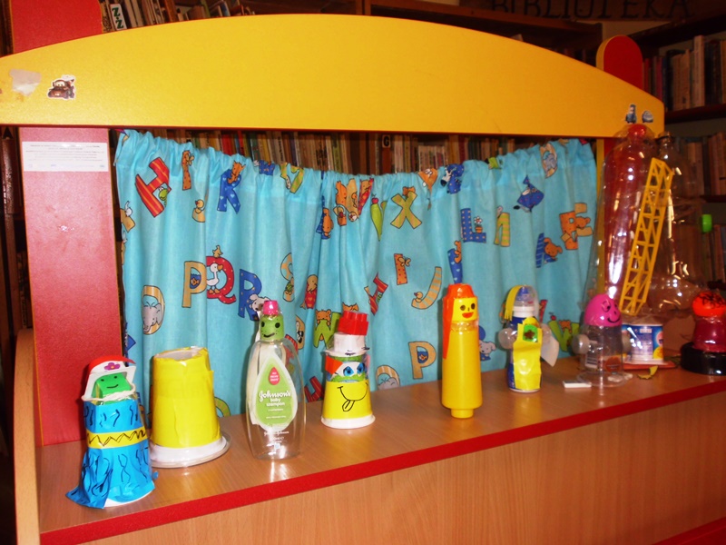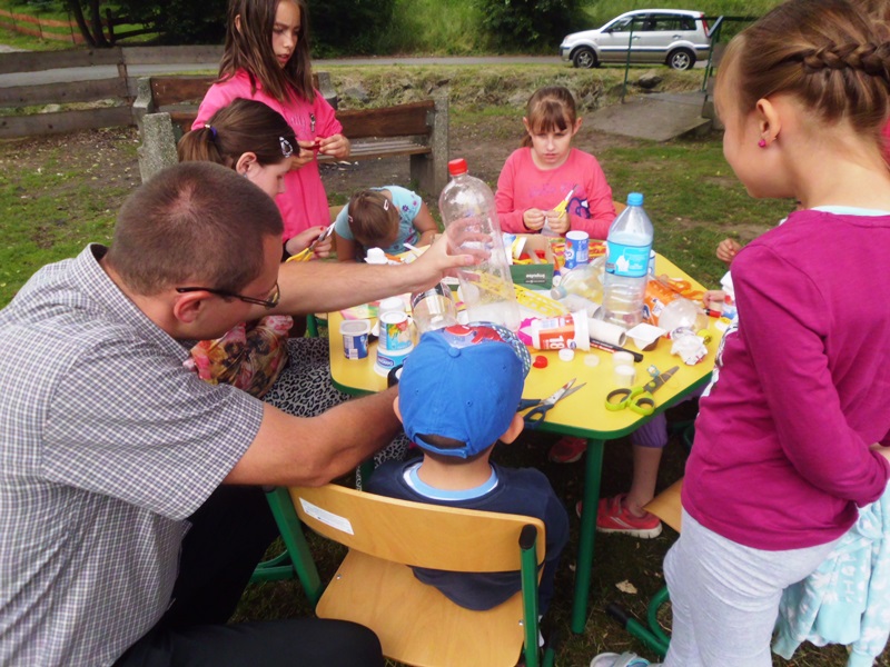 Wakacyjna przygoda w naszej bibliotece rozpoczęła się od zajęć zorganizowanych w ramach trwałości projektu Bajeczne Animacje Kulturalne. Korzystając z ładnej i uśmiechniętej pogody uczestnicy przenieśli się na boisko sportowe. W cieniu drzew przystąpiono do pracy nad nowymi bohaterami do bibliotecznego teatrzyku. Motywem przewodnim w działaniach było umiejętne wykorzystanie materiałów z odzysku. Główne tworzywo stanowił plastik, czyli kubeczki, butelki, nakrętki… Podczas pleneru prowadzono również dyskusje na temat recyklingu i ekologii.
