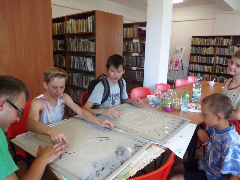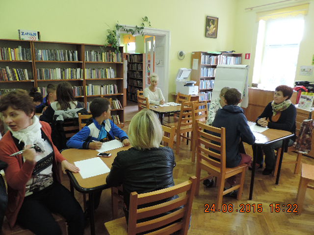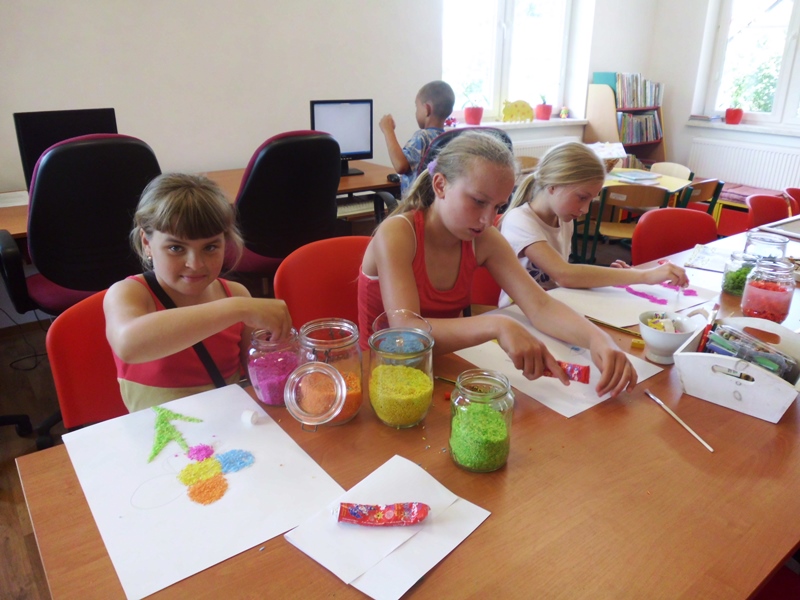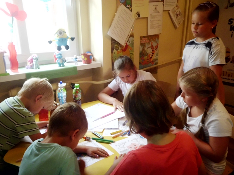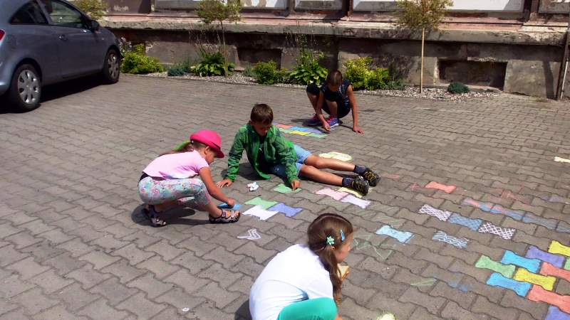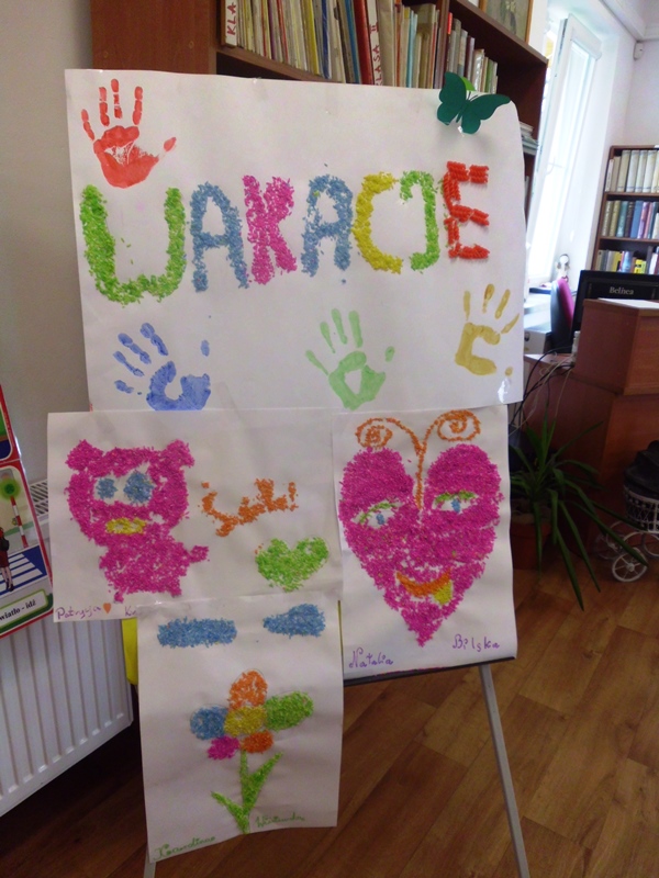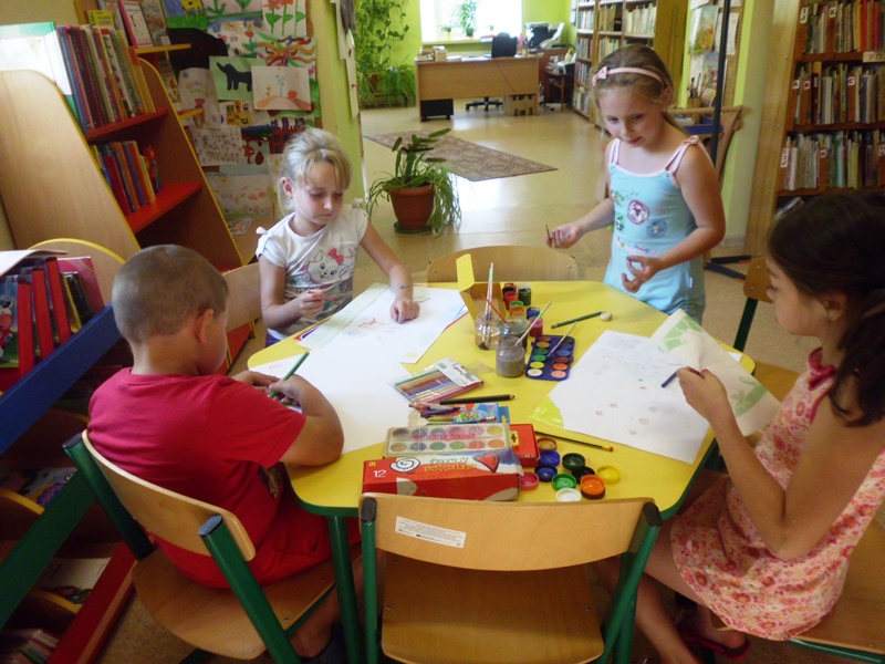 W wakacyjne środy czytelnicy spotykali się na zajęciach z ortografii, podczas których na wesoło rozstrzygano spory dotyczące „ż” i „rz” i nie tylko… Ćwiczono pisanie dyktand , wymyślanych przez uczestników spotkań. Okazało się, że wakacje to również świetny czas na to, by się czegoś nowego nauczyć, a przy tym nieźle bawić.Wielką literą piszemy wielowyrazowe nazwy geograficzne i miejscowe, np. Bory Tucholskie, Dolny Śląsk, Górny Śląsk, Jelenia Góra, Mała Panew, Morskie Oko, Nowa Zelandia, Rzeka Świętego Wawrzyńca, Stary Sącz, Wielki Kaukaz, Wielki Kocioł Śnieżny, Wielki Staw. Jeśli nazwa własna składa się z dwu członów i człon drugi jest rzeczownikiem w mianowniku nieodmieniającym się, wtedy człon pierwszy (wyraz pospolity): góra, nizina, półwysep, cieśnina, tama, kanał, morze, jezioro, wyspa, pustynia, wyżyna itp. piszemy małą literą, natomiast człon drugi – wielką, np. morze Marmara, półwysep Hel, pustynia Gobi, wyspa Uznam.W dniu 31 lipca 2015 przed biblioteką odbył się wakacyjny plener malarski . W tym celu wykorzystano plac parkingowy. W zajęciach uczestniczyły dzieci w wieku 8-10 lat, które swoją twórczość artystyczną wyraziły poprzez malowanie farbami, rysowanie kredą, kredkami, węglem. Wyobraźnia dzieci nie miała granic. Pogoda wyjątkowo dopisała, humory również.
