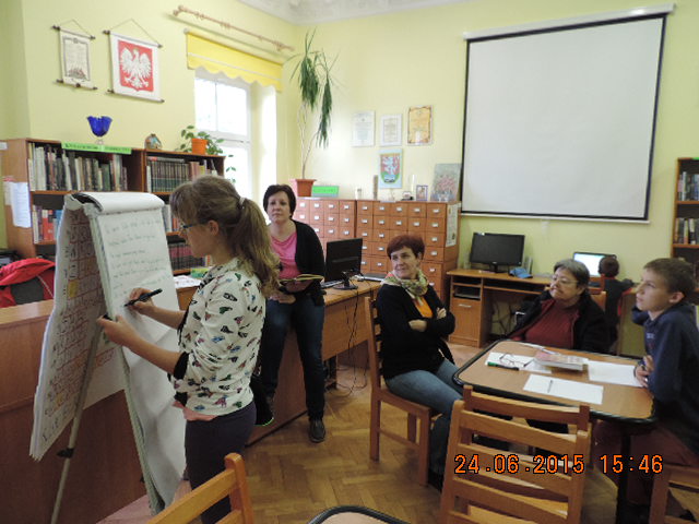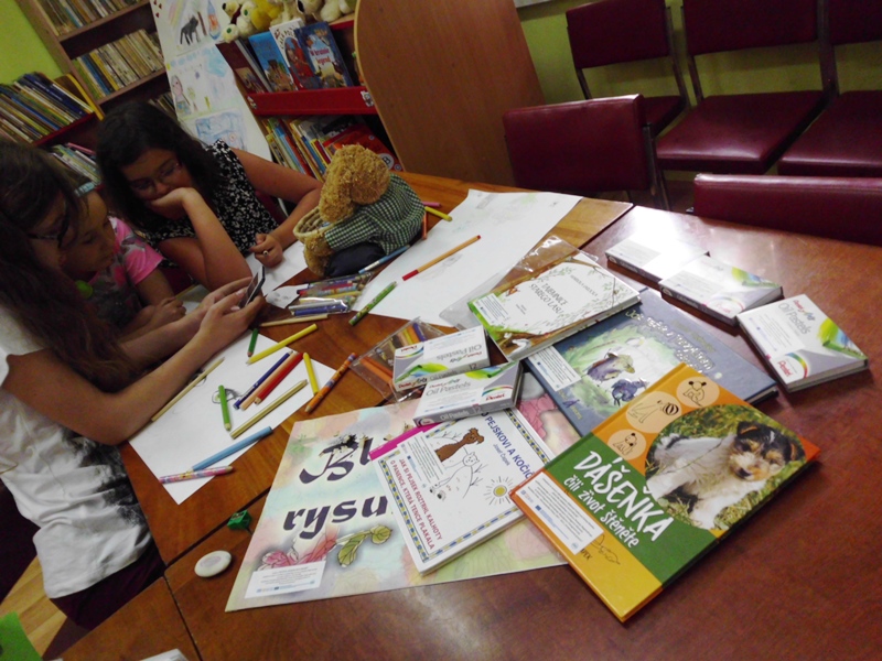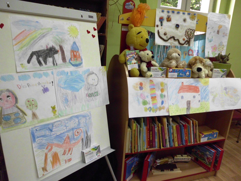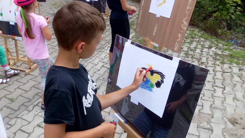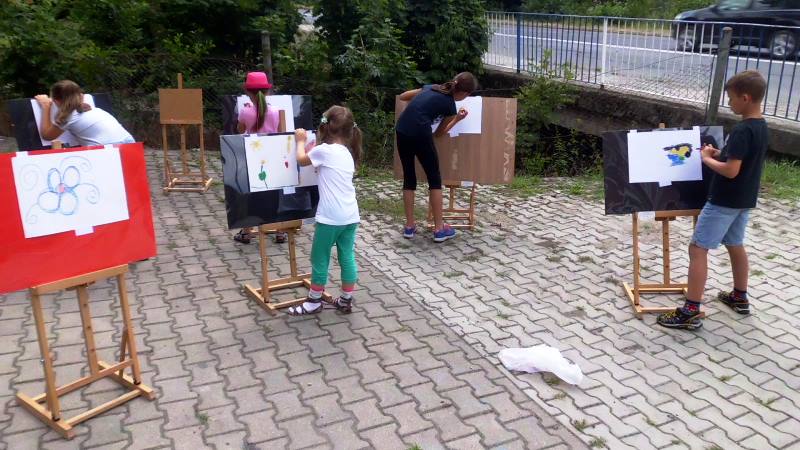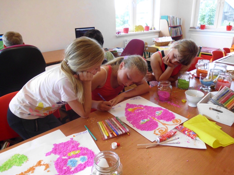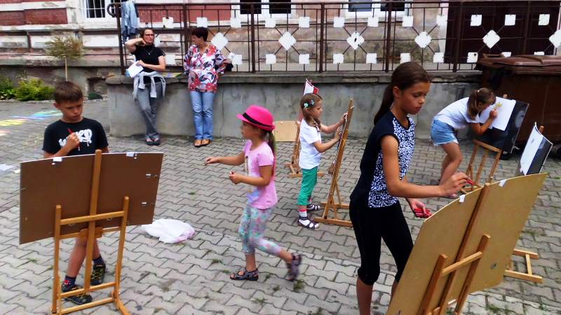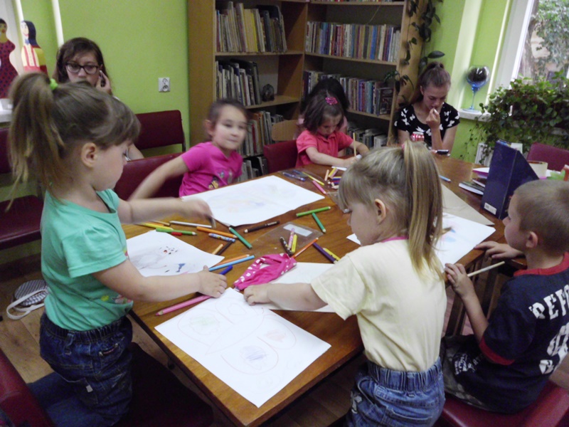 W wakacyjne środy czytelnicy spotykali się na zajęciach z ortografii, podczas których na wesoło rozstrzygano spory dotyczące „ż” i „rz” i nie tylko… Ćwiczono pisanie dyktand , wymyślanych przez uczestników spotkań. Okazało się, że wakacje to również świetny czas na to, by się czegoś nowego nauczyć, a przy tym nieźle bawić.Wielką literą piszemy wielowyrazowe nazwy geograficzne i miejscowe, np. Bory Tucholskie, Dolny Śląsk, Górny Śląsk, Jelenia Góra, Mała Panew, Morskie Oko, Nowa Zelandia, Rzeka Świętego Wawrzyńca, Stary Sącz, Wielki Kaukaz, Wielki Kocioł Śnieżny, Wielki Staw. Jeśli nazwa własna składa się z dwu członów i człon drugi jest rzeczownikiem w mianowniku nieodmieniającym się, wtedy człon pierwszy (wyraz pospolity): góra, nizina, półwysep, cieśnina, tama, kanał, morze, jezioro, wyspa, pustynia, wyżyna itp. piszemy małą literą, natomiast człon drugi – wielką, np. morze Marmara, półwysep Hel, pustynia Gobi, wyspa Uznam.W dniu 31 lipca 2015 przed biblioteką odbył się wakacyjny plener malarski . W tym celu wykorzystano plac parkingowy. W zajęciach uczestniczyły dzieci w wieku 8-10 lat, które swoją twórczość artystyczną wyraziły poprzez malowanie farbami, rysowanie kredą, kredkami, węglem. Wyobraźnia dzieci nie miała granic. Pogoda wyjątkowo dopisała, humory również.