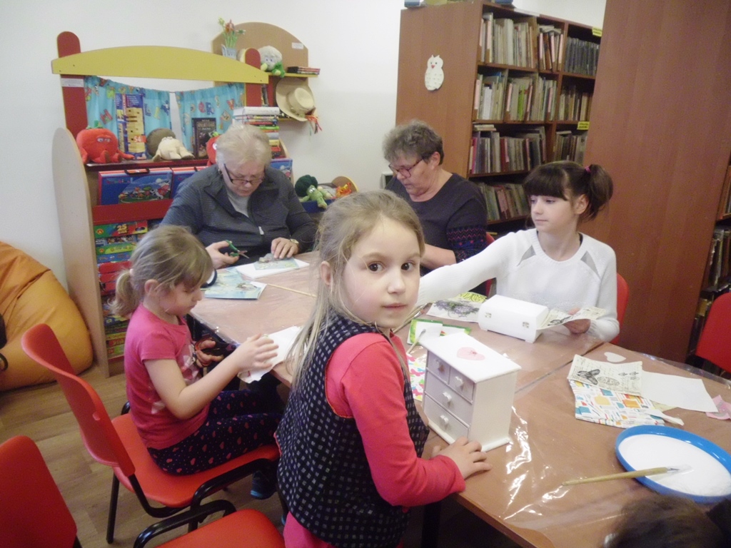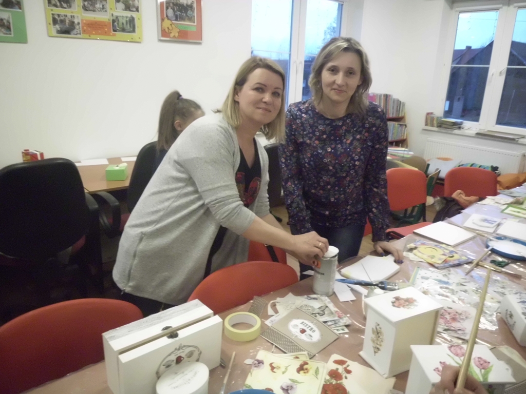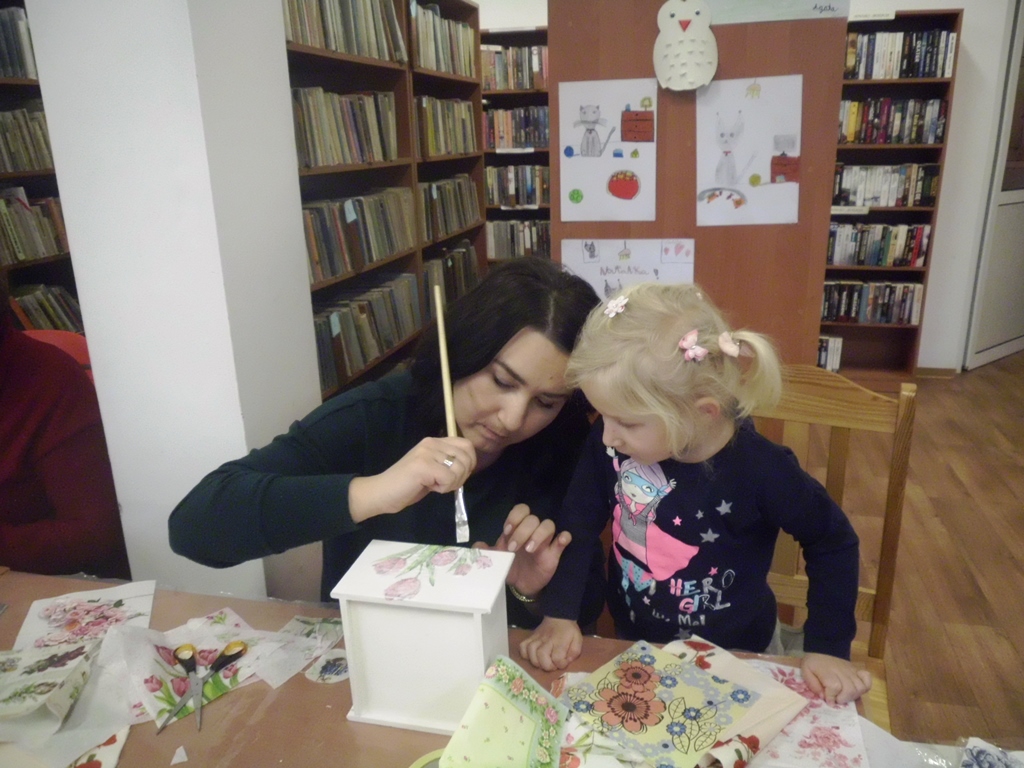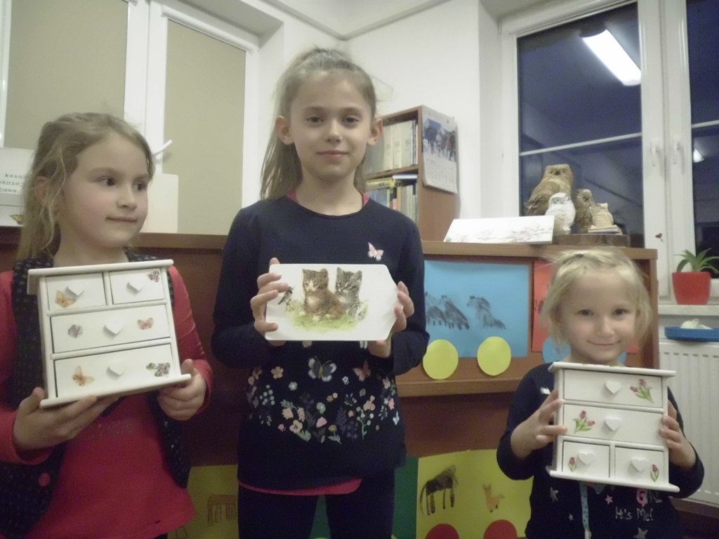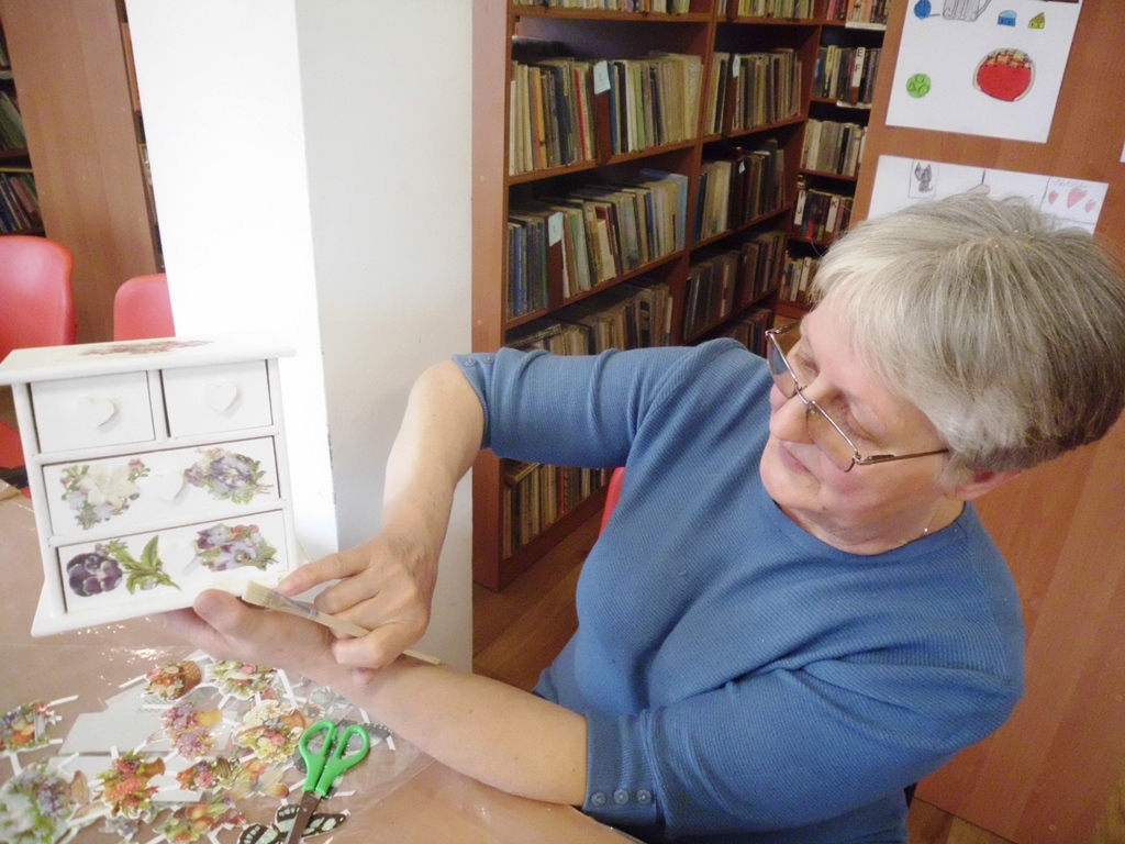 Prowadząca zajęcia, pani bibliotekarka Ewa pokazała na czym polega ta metoda twórczości kreatywnej. Podstawą jest przyklejenie na pomalowany przedmiot wzorów i motywów wyciętych z serwetki lub papieru. Pokrycie go wieloma warstwami lakieru. Doskonale prezentuje się na meblach, doniczkach, czy drewnianych przedmiotach.