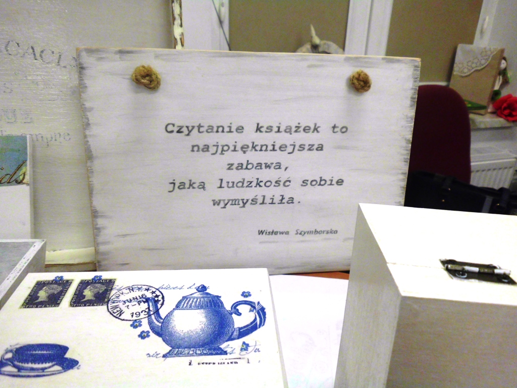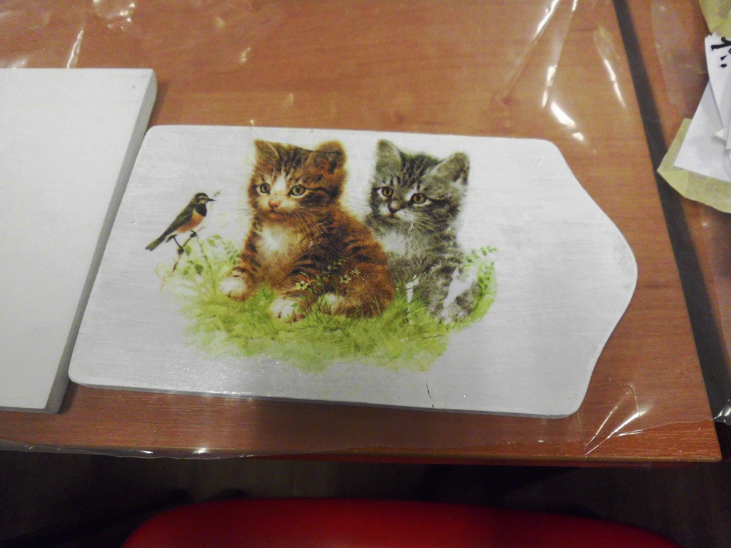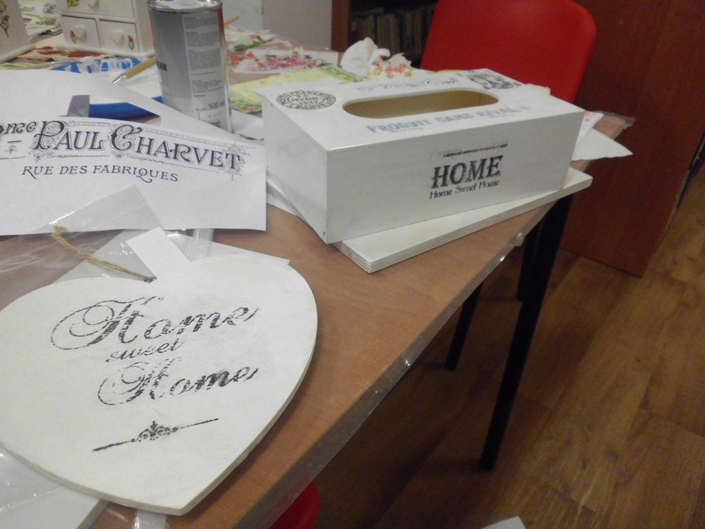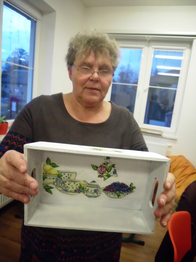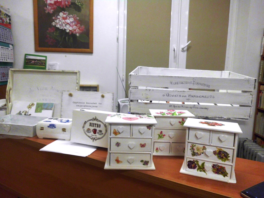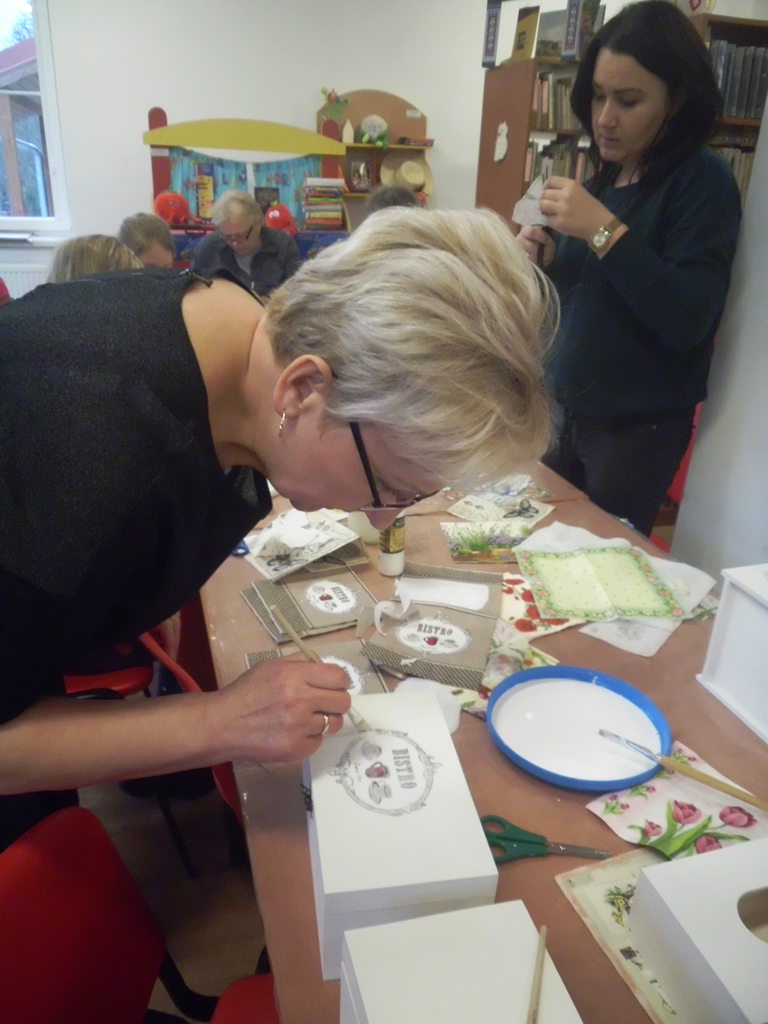 Prowadząca zajęcia, pani bibliotekarka Ewa pokazała na czym polega ta metoda twórczości kreatywnej. Podstawą jest przyklejenie na pomalowany przedmiot wzorów i motywów wyciętych z serwetki lub papieru. Pokrycie go wieloma warstwami lakieru. Doskonale prezentuje się na meblach, doniczkach, czy drewnianych przedmiotach.