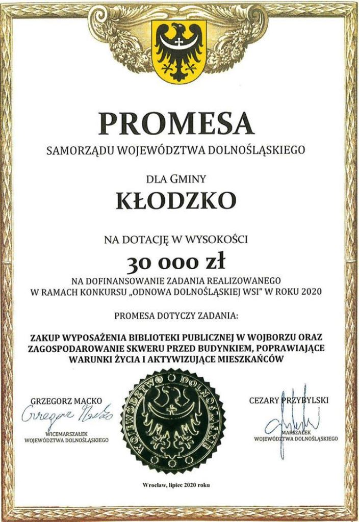 Promesę finansową w dniu 6 lipca 2020 roku odebrał Wójt Gminy Kłodzko Zbigniew Tur z rąk Wicemarszałka Województwa Dolnośląskiego Grzegorza Macki oraz Posła na Sejm RP Marcina Gwoździa.