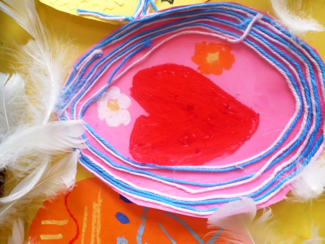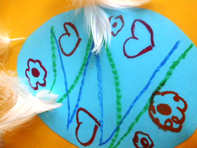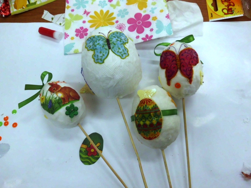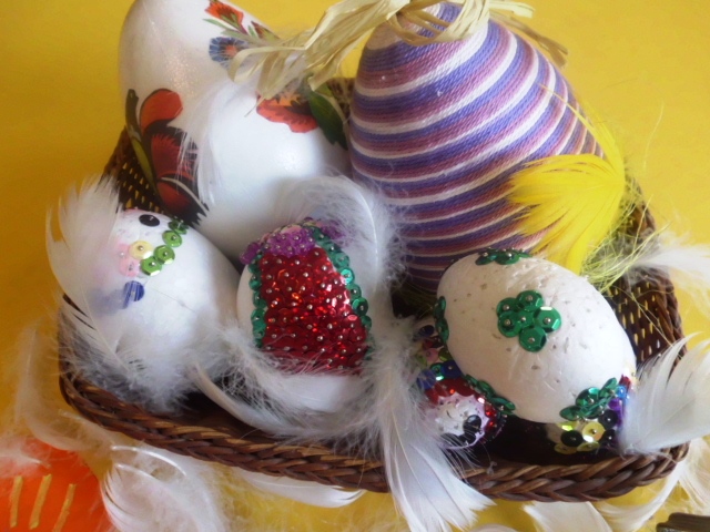 Wyklejanki - jajka z naklejonym obrazkiem z listków, sitowia, włóczki itp.