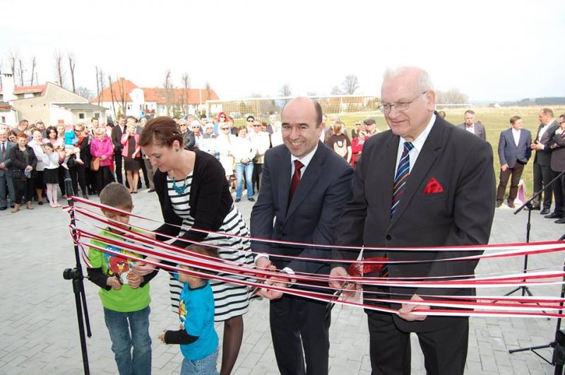 Wójt gminy Stanisław Longawa, Członek Zarządu Województwa Dolnośląskiego Tadeusz Samborski, radna oraz sołtys Starego Wielisławia Marta Brogowska i przedszkolaki Tomek i Krzysiek