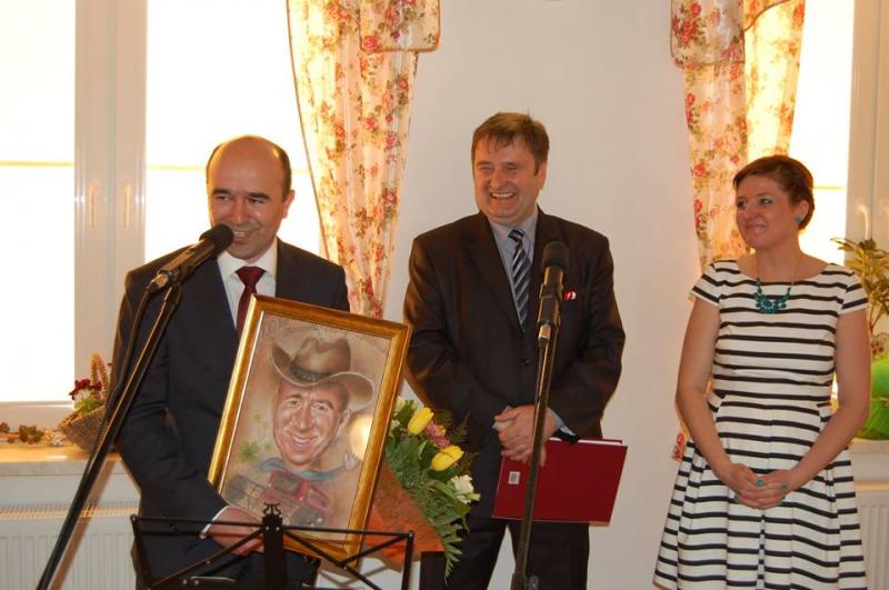 Przewodniczący Komisji Budżetu i Finansów Sejmiku Województwa Dolnośląskiego Czesław Kręcichwost, Michał Dmitrowicz jako przedstawiciel młodzieży wraz z tatą Aleksandrem Dmitrowiczem z zespołu "Śpiewanki z łapanki"