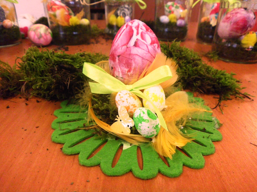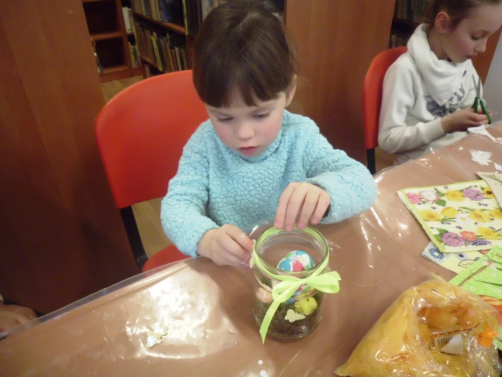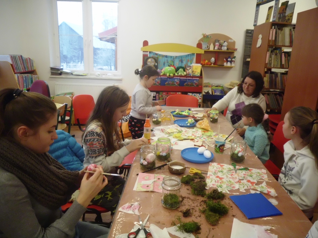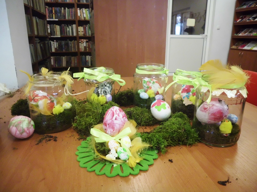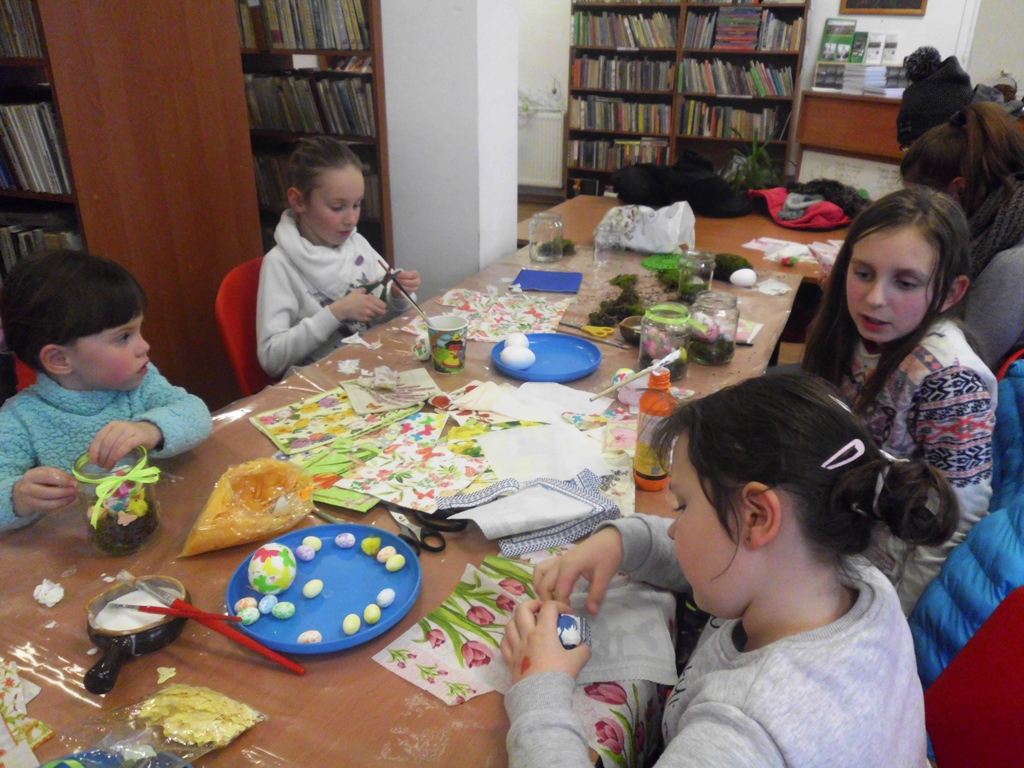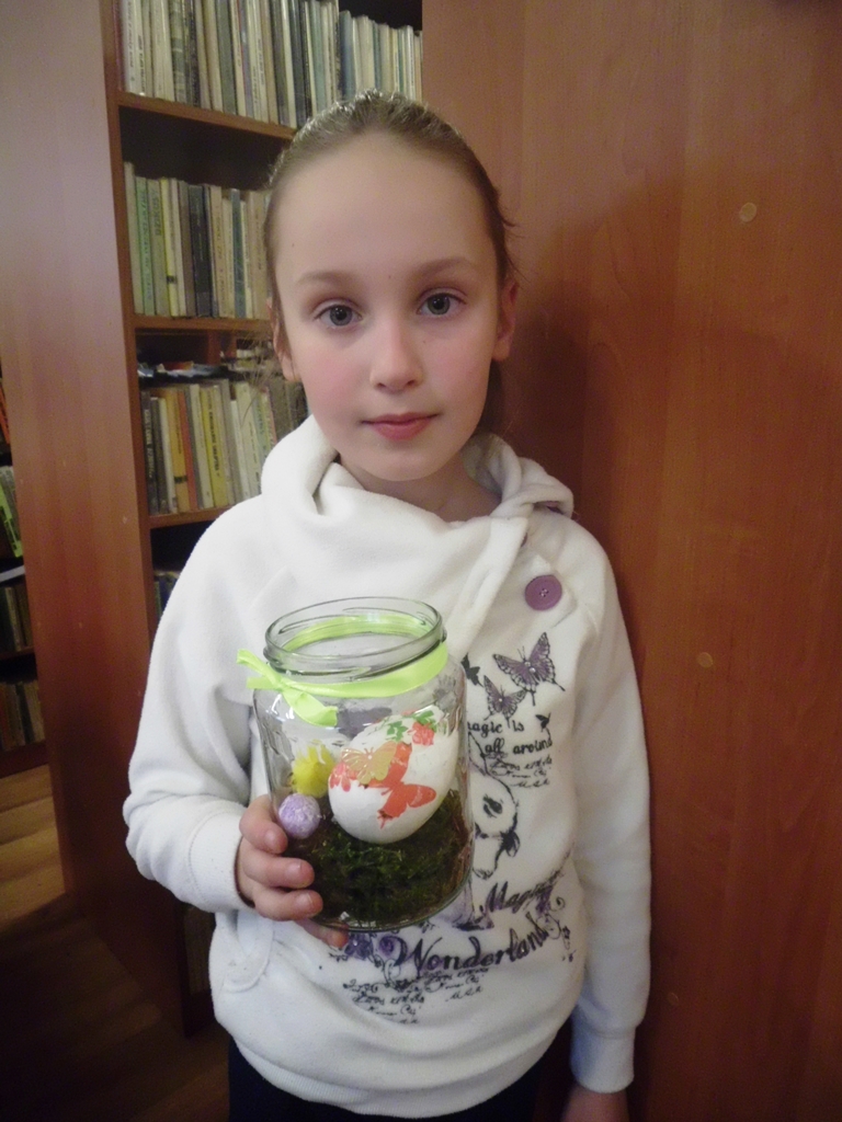 W rytm wiersza Konstantego Ildefonsa Gałczyńskiego, Filia Biblioteki Publicznej Gminy Kłodzko w Starym Wielisławiu zaprosiła swoich wiernych czytelników na warsztaty wielkanocne. W tym roku, pani bibliotekarka Ewa zaproponowała dzieciom wykonanie dekoracji jajek metodą serwetkową. W pierwszej fazie wycinano różnorodne elementy. Następny etap to wyklejanie. W trzeciej strefie powstały dekoracje w słoikach i na filcu. Do ich powstania użyto mech, tasiemki, kurczaki, piórka i inne różnorodności…