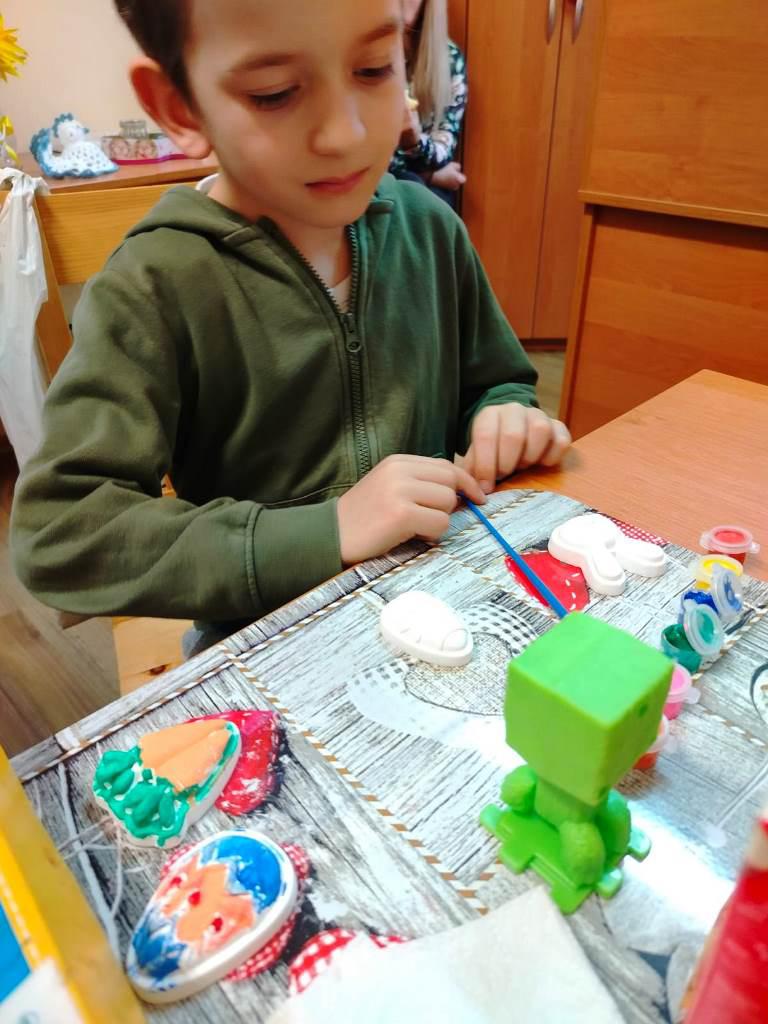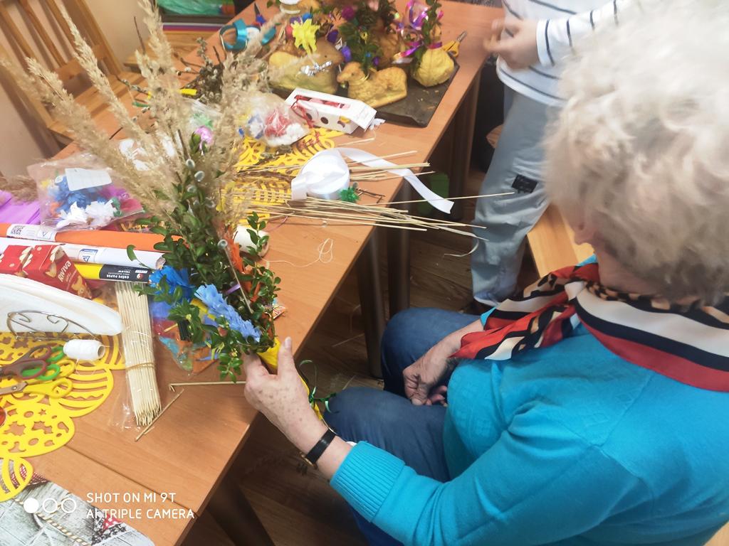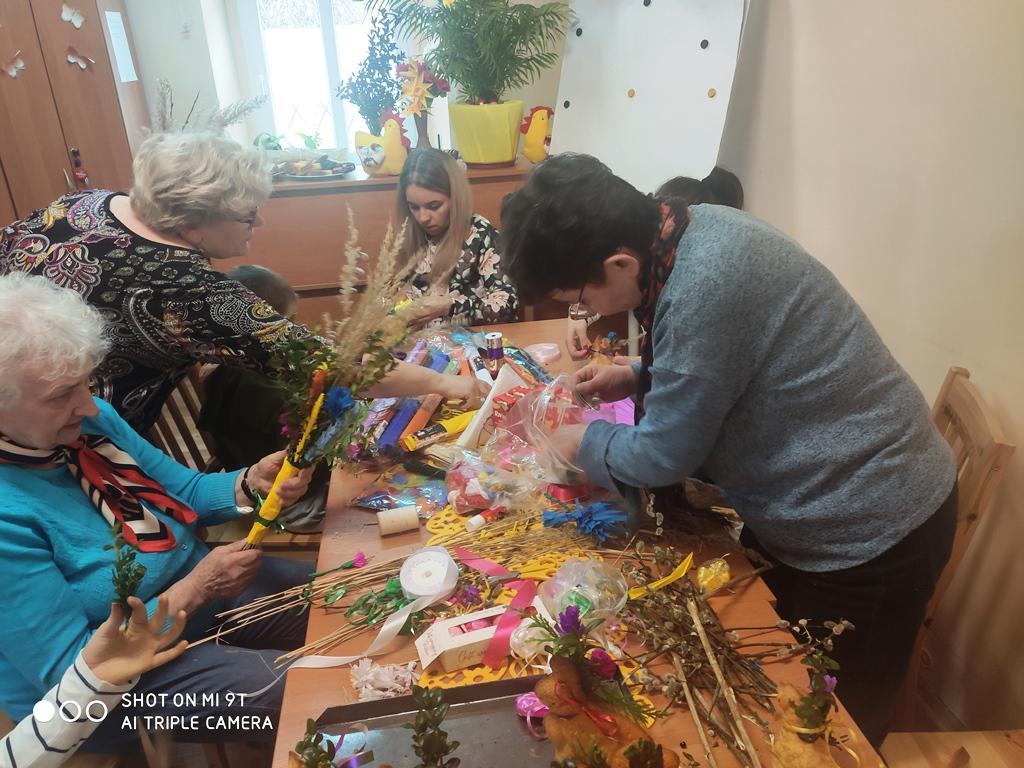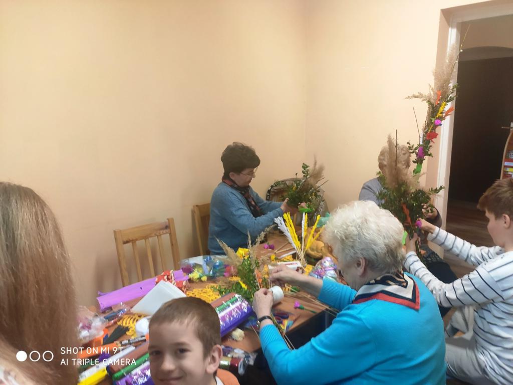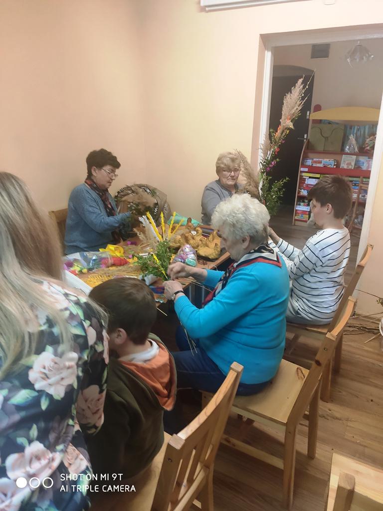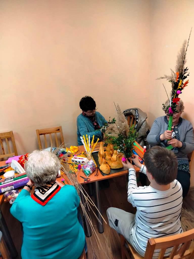 Podczas wspólnych wielkanocnych warsztatów odbywających się w Filii Biblioteki Publicznej Gminy Kłodzko w Wojciechowicach, panie z Koła Gospodyń Wiejskich, Klubu Seniora oraz panie ze świetlicy i biblioteki, w towarzystwie dzieci, wspólnie zaangażowały się w tworzenie ekologicznych ozdób świątecznych. Powstały piękne palmy wielkanocne, figurki gipsowe, baranki, kurki oraz zajączki – te ostatnie wykonane z ciasta wypieczonego przez Koło Gospodyń Wiejskich.