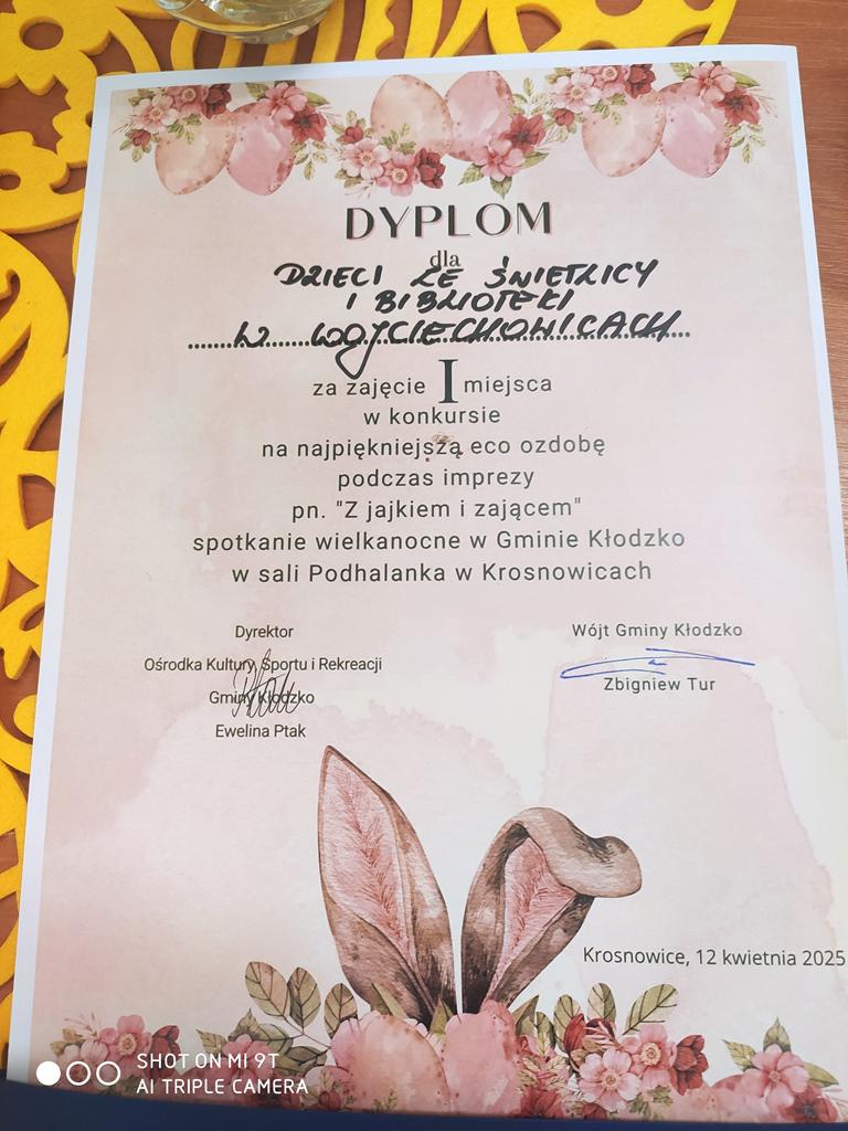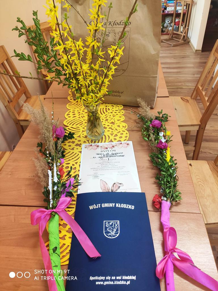 -Jesteśmy dumni za zajęcia 1 miejsca w zorganizowanym pn." Z jajkiem i zającem" konkursie na najpiękniejszą ozdobę w ramach spotkania wielkanocnego w Gminie Kłodzko w sali Podhalanka w Krosnowicach – podkreśla bibliotekarka Małgosia.