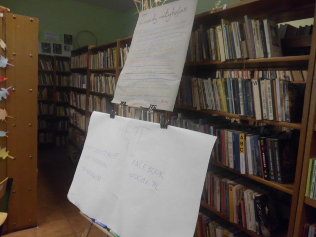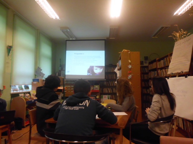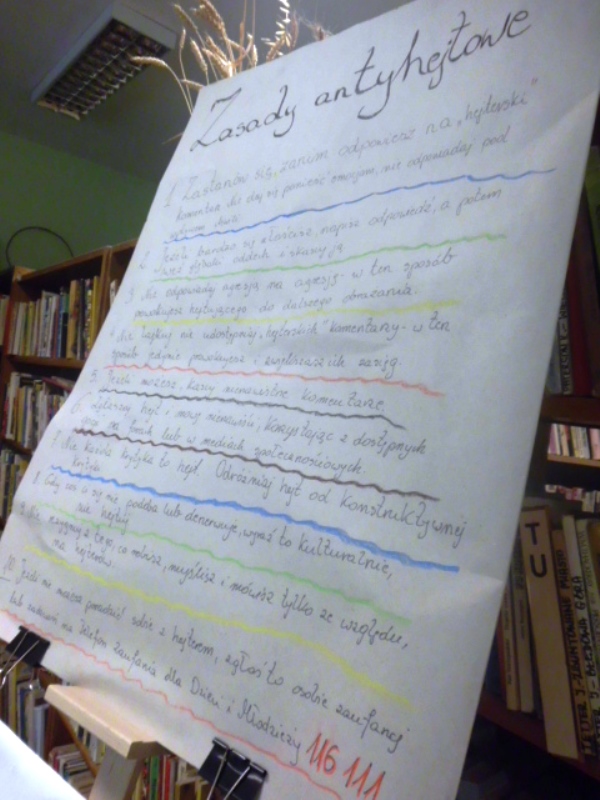 Naszym celem, było uświadomienie negatywnych skutków hejtowania i zachęcenie do przeciwstawiania się niewłaściwym zachowaniom w sieci – informuje pani Mariola Huzar, obecna na spotkaniu dyrektor Biblioteki. „Zamiast hejtu” to propozycja edukacyjna podejmująca ten temat dość szczegółowo. Bibliotekarka Magdalena Berestecka oraz informatyk Paweł Strycharz zaprezentowali kilka sposobów reagowania na tego typu treści, poszukiwanie alternatywnych sposobów wyrażania swojej opinii. Podczas zajęć wykorzystaliśmy film edukacyjny kampanii Add Friend przygotowany przez firmę Disney Polska wraz z Fundacją Dzieci Niczyje.