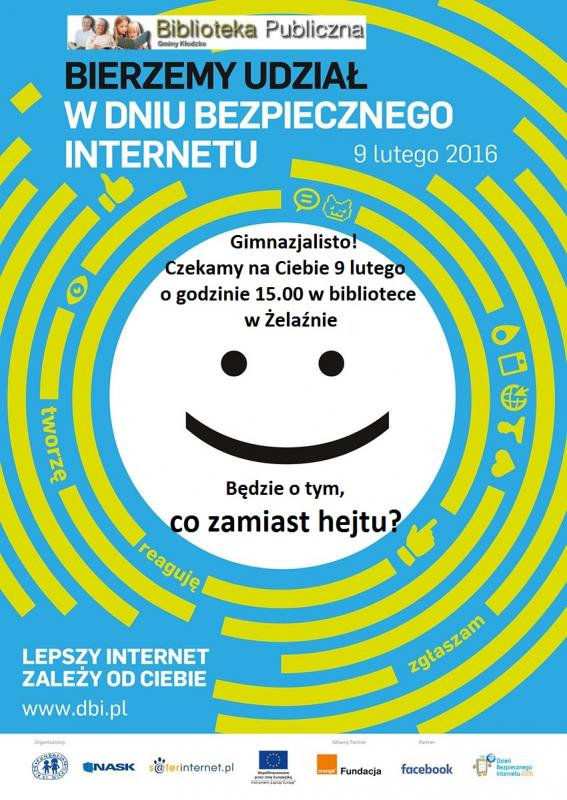 We wtorek 9 lutego, w Filii Biblioteki Publicznej Gminy Kłodzko w Żelaźnie zostały przeprowadzone zajęcia z okazji Dnia Bezpiecznego Internetu pod hasłem „Lepszy Internet zależy od Ciebie”. Na spotkanie przyszło pięciu gimnazjalistów: Ola, Natalia, Emil, Marcin i Damian.