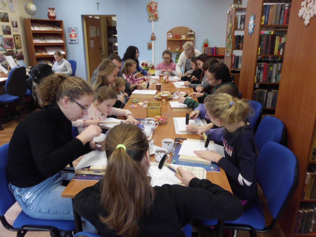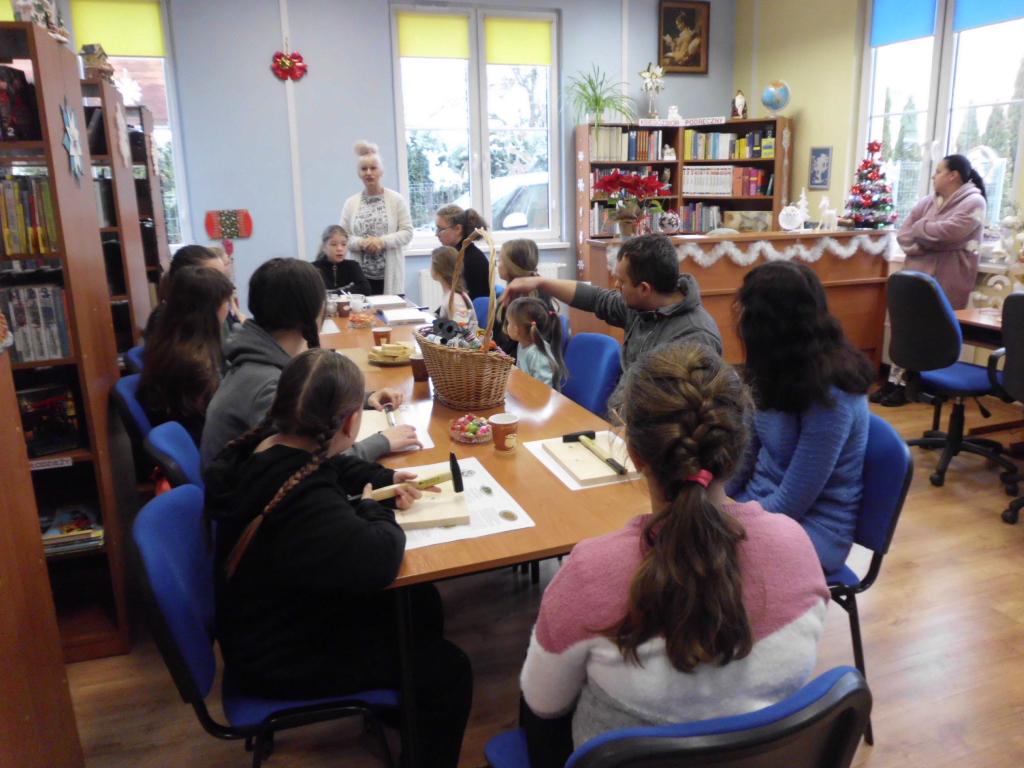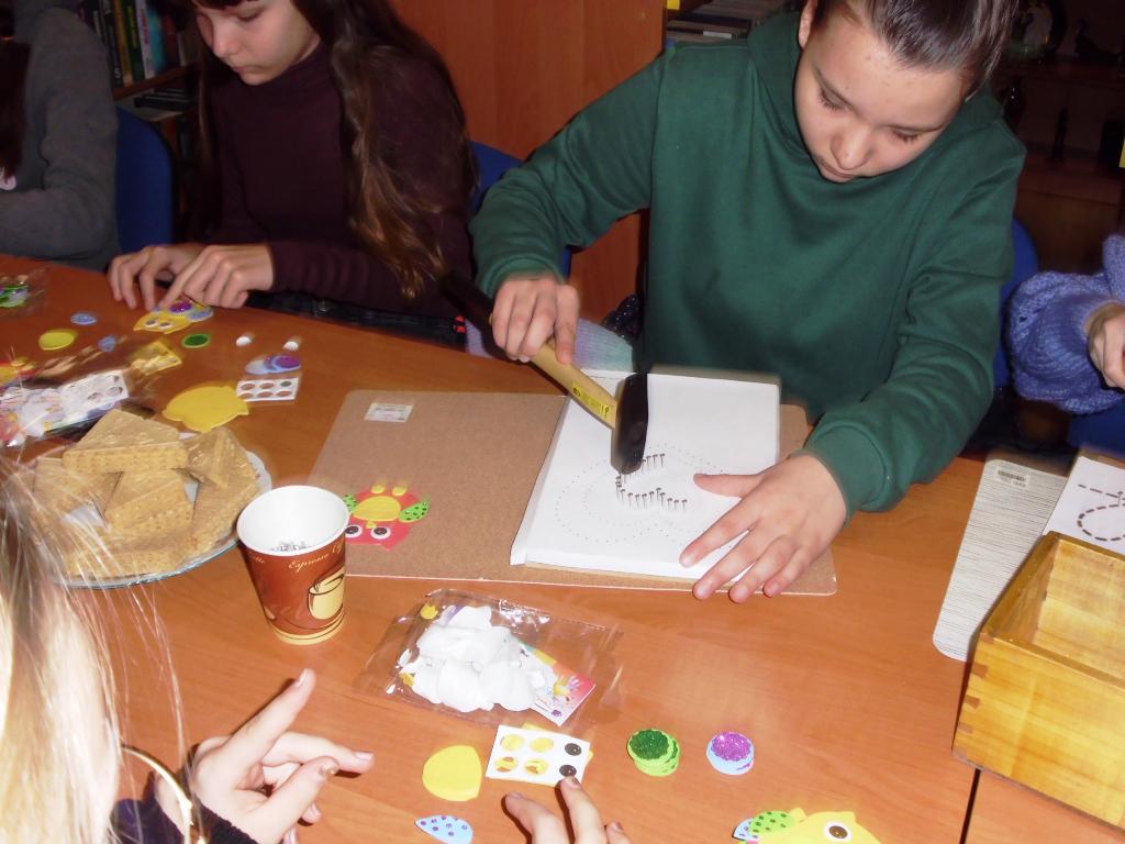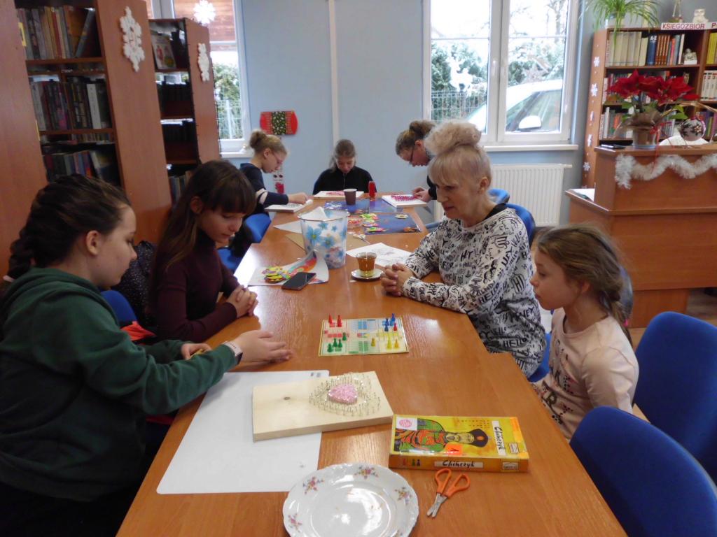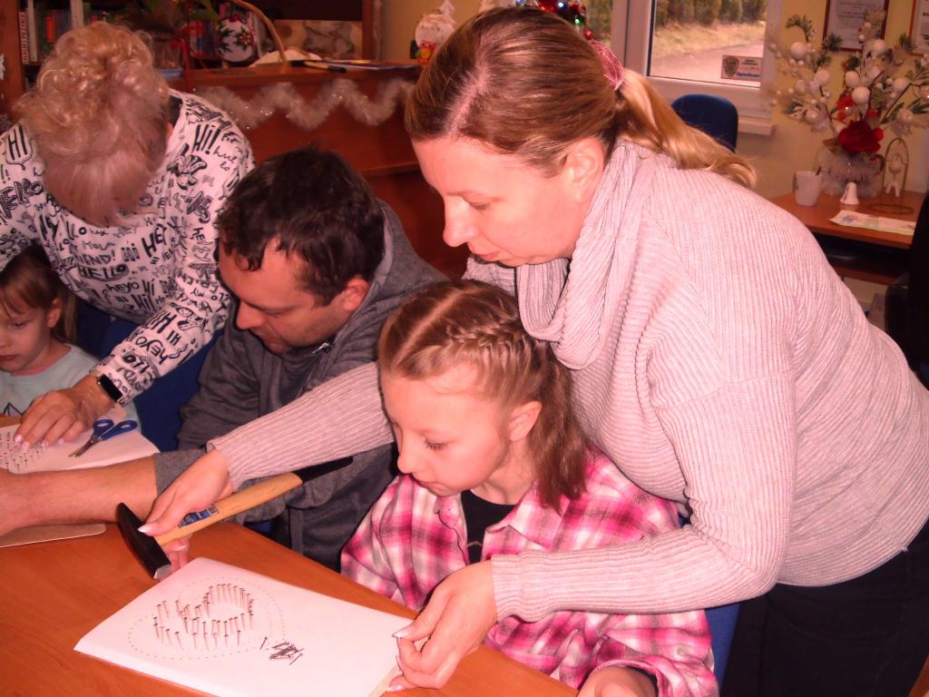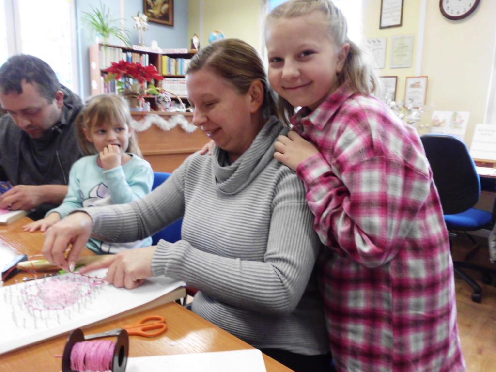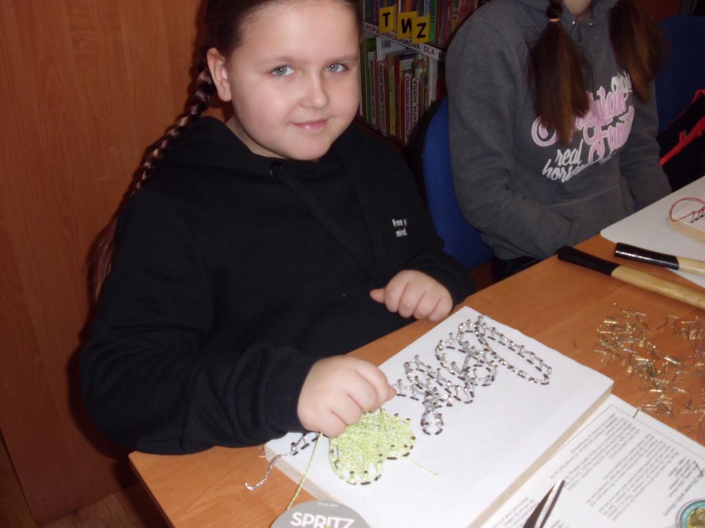 Za stołami warsztatowymi zasiadły dzieci i młodzież w różnym wieku. Cieszyła nas obecność młodej czytelniczki z Łodzi, która przyjechała do Bierkowic do rodziny na ferie zimowe. Niektóre osoby były wspierane przez rodziców. Okazało się, że dotychczas nikt jeszcze nie pracował metodą string.art., więc zajęcia okazały się ciekawą atrakcją.