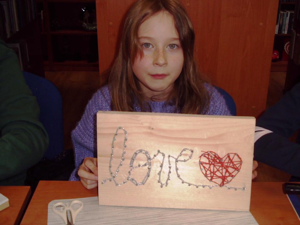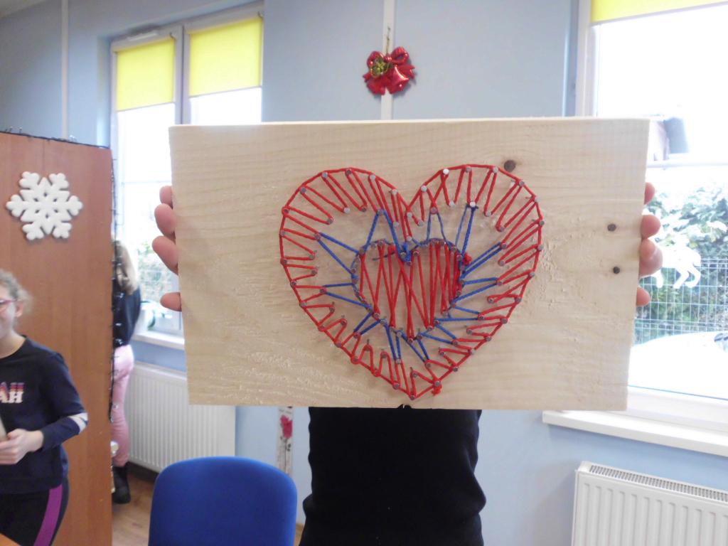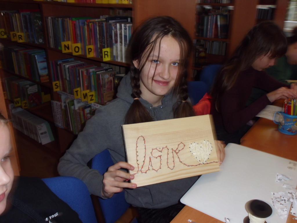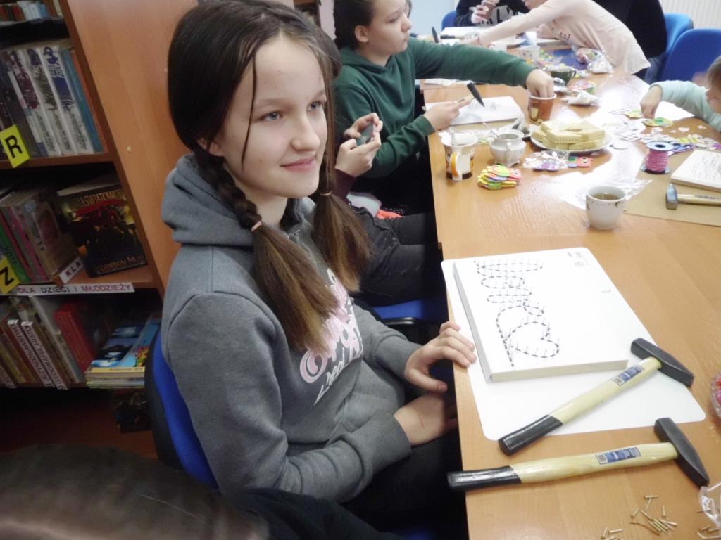 String.art. to matematyka, geometria, stolarstwo, roboty budowlane i w końcu wyszywanie. W przestrzeni bibliotecznej w pierwszym etapie słychać było stukot młotków. Każdy „wybijał” swój walentynkowy wzór.