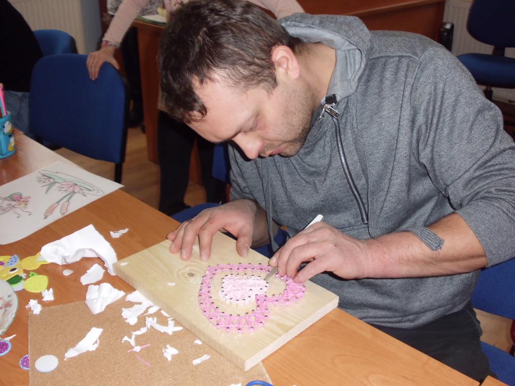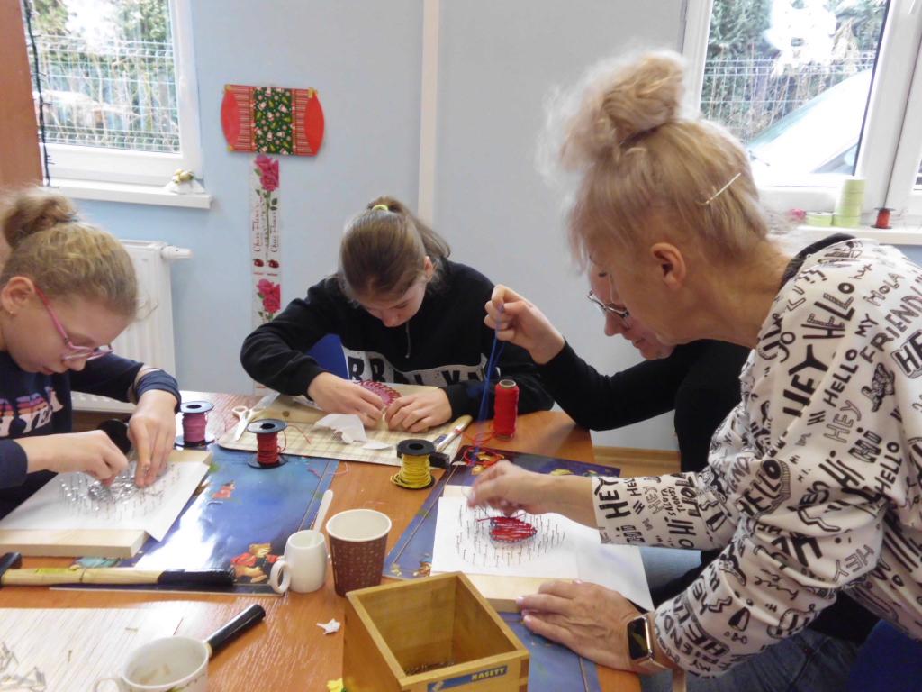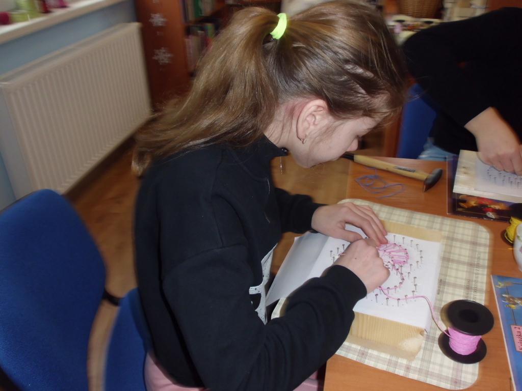 W drugim etapie przystąpiono do wyszywania, gdzie niezbędne były gwoździe, sprawne palce i nici. Wszyscy mogli liczyć na pomoc dyrektorki Biblioteki. Nie mały podziw wzbudził tatuś Bożenki , który wkręcił się w ten sercowy proces. Efekt końcowy oceni żona, ale wszyscy byli zachwyceni…