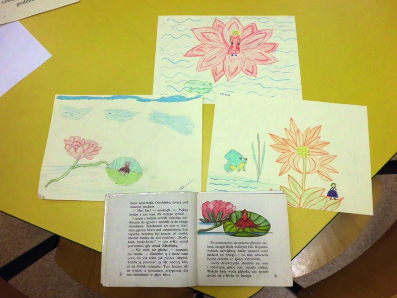 Podczas czwartkowych spotkań dzieci brały udział w głośnym czytaniu baśni, tych dobrze znanych i tych mniej znanych. Podobnie, jak w poprzednim roku największym powodzeniem cieszyło się opowiadanie „Imbryk”. Chłopcy często wracali do wersji komiksowej opowiadania ”Imbryk”, którą sami stworzyli w 2015 roku, korzystając z dostępnej aplikacji na naszych tabletach. Dziewczynki wolały zajęcia plastyczne, podczas których wykonywały nowe ilustracje do opowiadania "Calineczka" – relacjonuje pani bibliotekarka Agata.