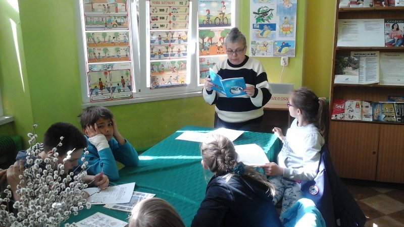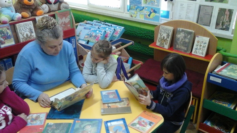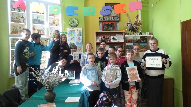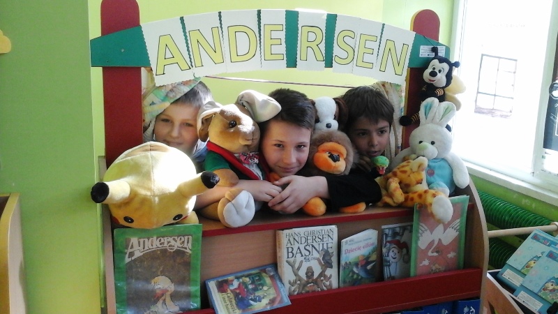 Na zajęcia zaproszeni zostali uczniowie klasy drugiej i piątej z miejscowego Zespołu Szkół wraz z nauczycielami, paniami Alicją Stefaniak, Dagmarą Łastowską i i Renatą Koźlik. Pani Dagmara (szkolna bibliotekarka) przedstawiła życiorys duńskiego pisarza oraz przeczytała baśń pt. „Słowik”. Pani Renata zaznajomiła obecnych z tytułami znanych i mniej znanych baśni bajkopisarza oraz czytała baśń pt. „Dzielny ołowiany żołnierzyk”. Ta baśń skupiła uwagę przede wszystkim chłopców, którzy później próbowali swoich sił w teatrzyku kukiełkowym – opowiada pani bibliotekarka Małgorzata.