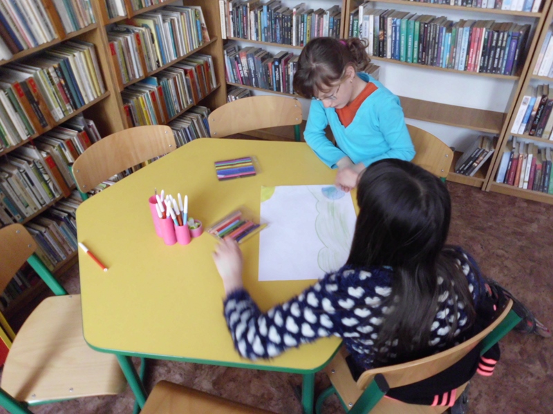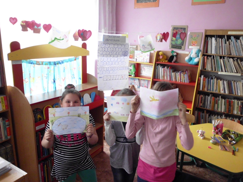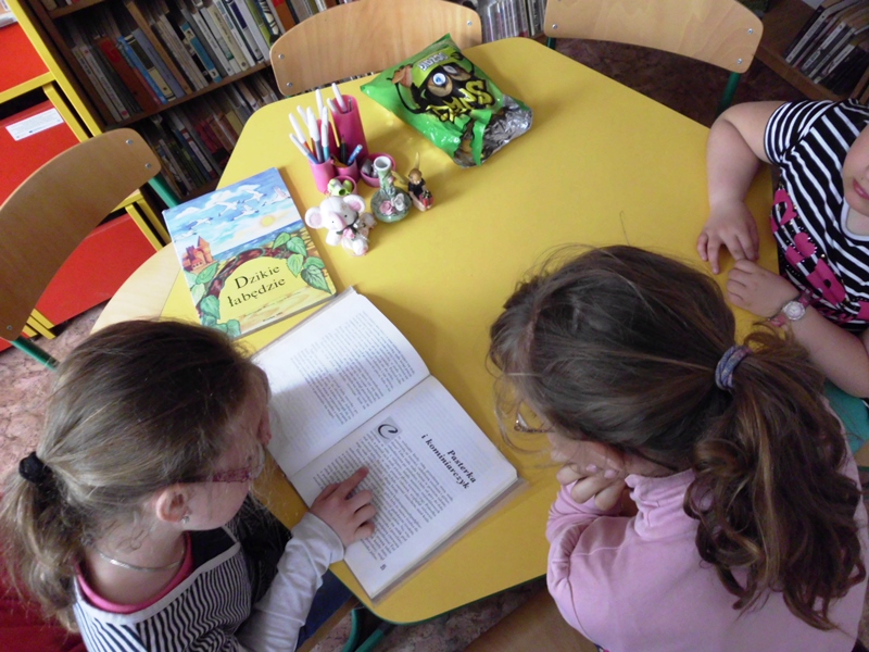 Na zajęciach pojawiła się piątka dzieci, które zainspirowały się takimi baśniami jak „Dzikie łabędzie”, „Pasterka i kominiarczyk” oraz „Calineczka”. Wokół tych tytułów pani bibliotekarka Małgorzata zbudowała krzyżówkę, z którą dzieci rozprawiły się na szóstkę. Aby herbatka jeszcze bardziej smakowała, dziewczynki wykonały ilustracje do ulubionych scen z czytanych baśni.