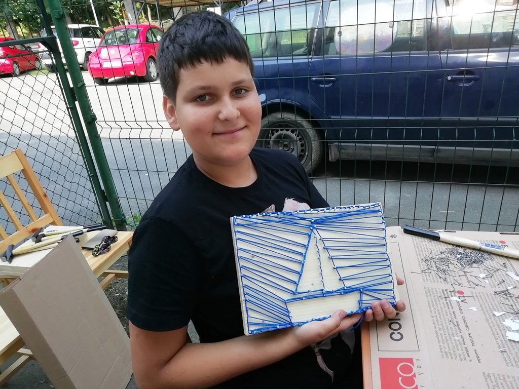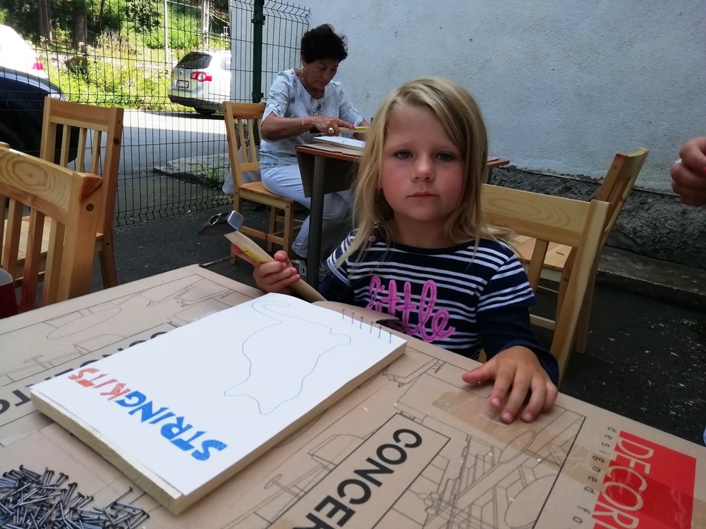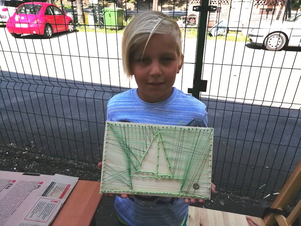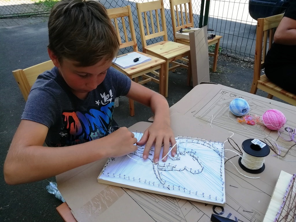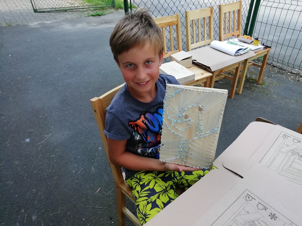 Ciekawą propozycją w wakacyjnej ofercie Filii Biblioteki Publicznej Gminy Kłodzko w Wojciechowicach były zajęcia STRING ART. To technika wyplatania różnych obrazków z kolorowej włóczki, muliny lub nici na drewnie. Kontury wyplatanych wzorów najpierw „nanosi” się rysując konkretny wzór, a następnie wbija się w kontur gwoździe, które stają się „stelażem” dzieła. Dzięki tej technice możemy w dziecinny sposób wykonać niezwykle, unikalne ozdoby do domu, biura lub po prostu zrobić komuś oryginalny i spersonalizowany prezent od serca.