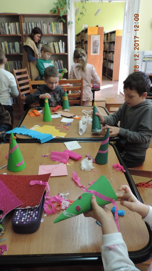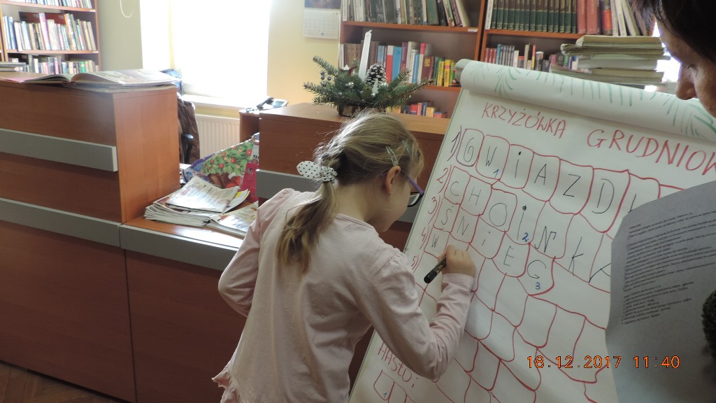 Dzieci rozwiązały krzyżówkę grudniową. Wspólnie z bibliotekarzami wykonały dekoracje na swoich choinkach. Ułożyły piękne życzenia na mega kartkę świąteczną, która stoi tuż przy bibliotecznej choince. Na pamiątkowym zdjęciu pozostawiły wiele uśmiechów i radości…