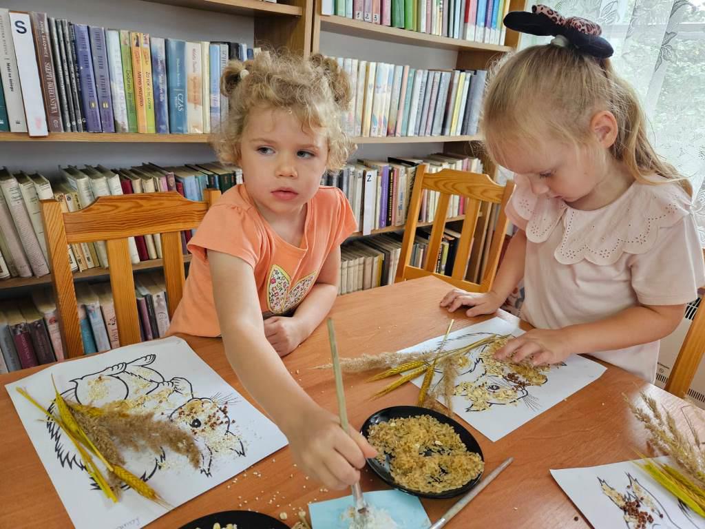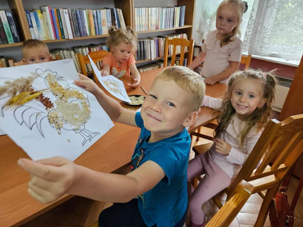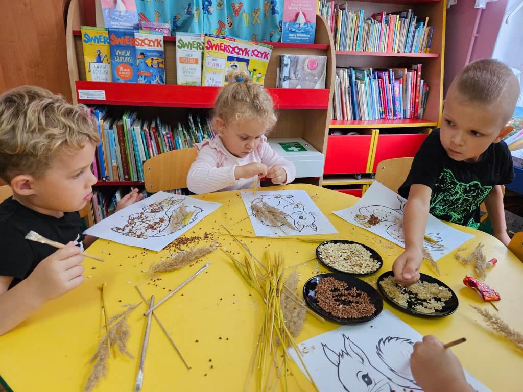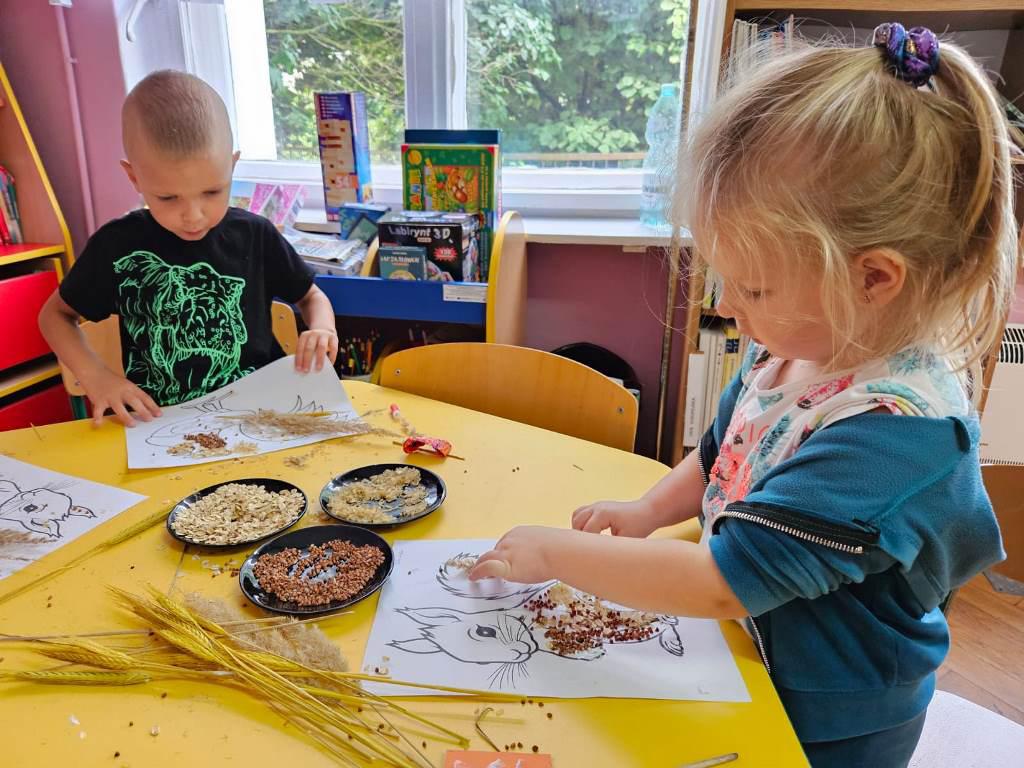 W części kreatywnej, dzieci za pomocą kasz, płatków owsianych oraz ryżu i kłosów zdobiły wiewiórkę i koguta.