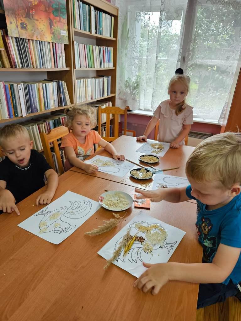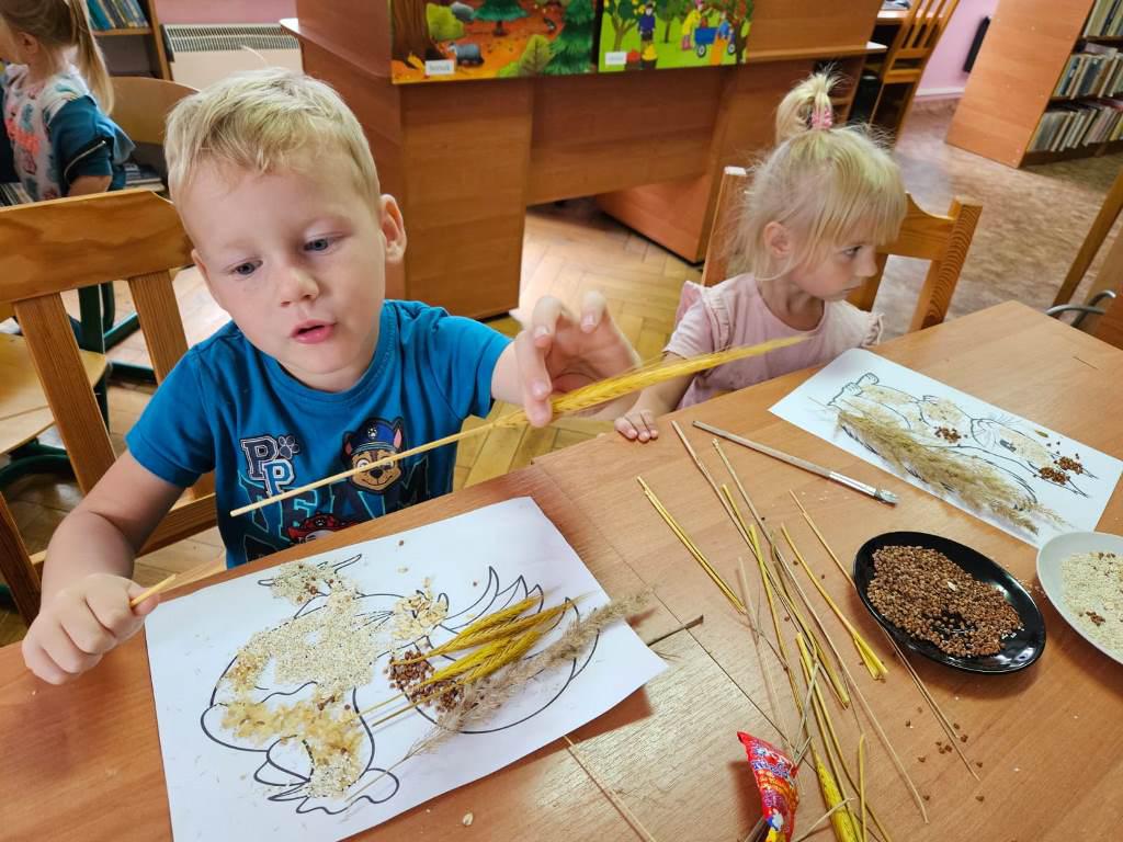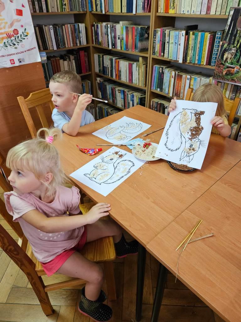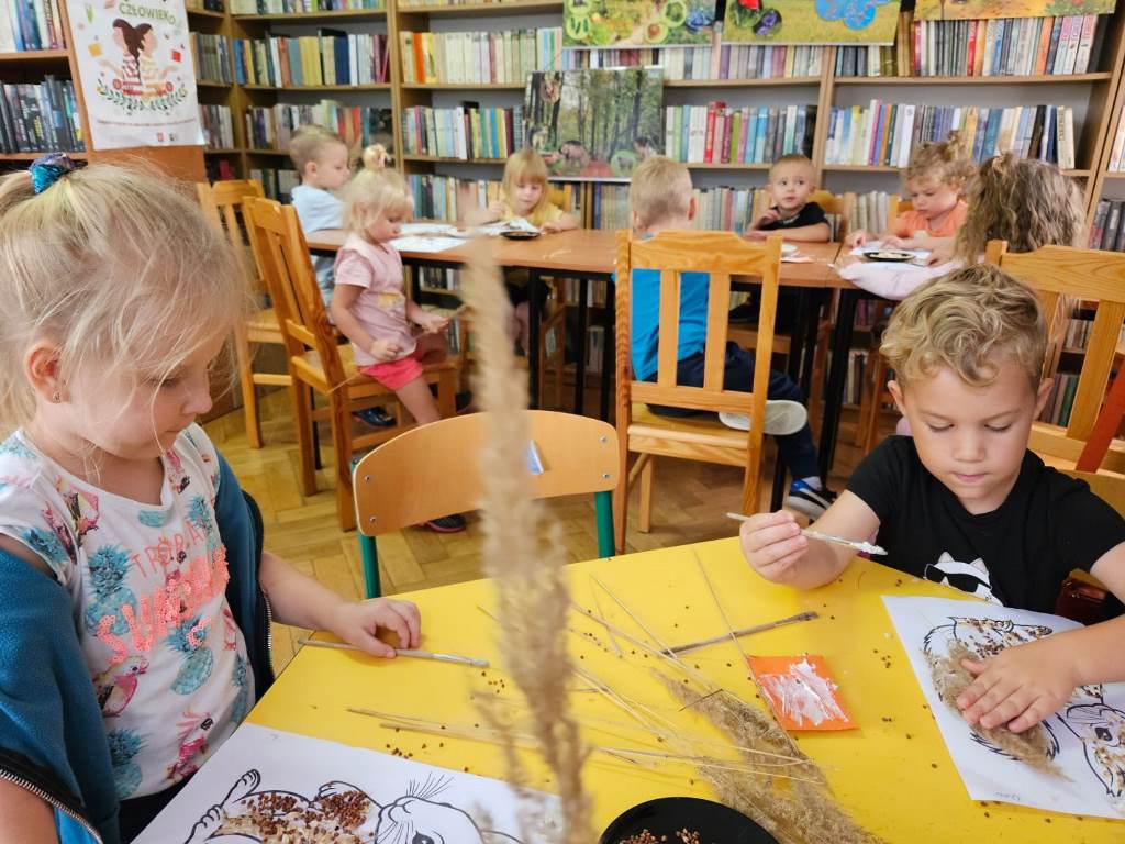W części kreatywnej, dzieci za pomocą kasz, płatków owsianych oraz ryżu i kłosów zdobiły wiewiórkę i koguta.