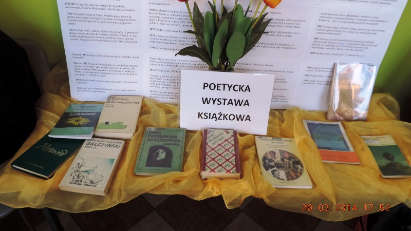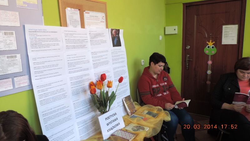 Popołudniówka w bibliotece była także okazją do wspominania życia i twórczości znakomitej poetki Wisławy Szymborskiej. O cały anturaż święta poezji zadbała pani Małgorzata Kłonowska – starszy bibliotekarz, o której czytelnicy wypowiadali się bardzo ciepło i proszą o więcej popołudniówek z poezją.