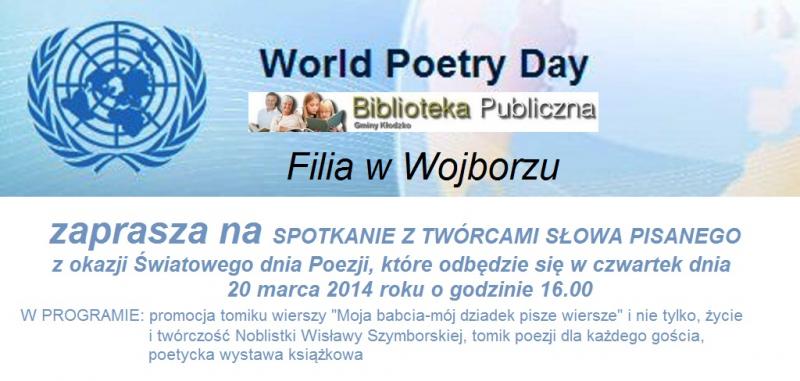 Z okazji Światowego Dnia Poezji w bibliotece w Wojborzu przy kawie i ciasteczku spotkali się miłośnicy poezji oraz lokalni twórcy słowa pisanego. Na początek dyrektor Biblioteki Publicznej Gminy Kłodzko pani Mariola Huzar zaprezentowała tomik wierszy „Moja babcia – mój dziadek pisze wiersze”, wydany w ramach projektu „Euroregionalne Spotkania Obywatelskie”, współfinansowanego ze środków Europejskiego Funduszu Rozwoju Regionalnego i Programu Operacyjnego Współpracy Transgranicznej Republika Czeska – Rzeczpospolita Polska 2007-2013 oraz budżetu państwa za pośrednictwem Euroregionu Glacensis „Przekraczamy granice”.