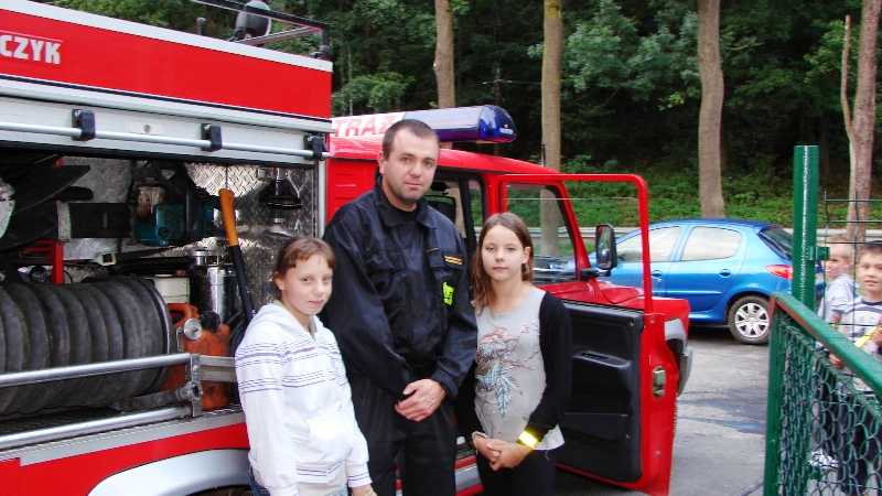 Czy wiecie, jak się obronić przed agresywnym psem? – pytała umundurowana nadkomisarz Wioletta Martuszewska. Paniczna ucieczka nie jest tu wskazana Zostanie potraktowana jako dodatkowa prowokacja do walki. Równie zgubne w skutkach stanie się patrzenie psu prosto w oczy. Histeria czy głośne krzyki dodatkowo rozdrażnią zwierzaka. Zaprezentowana została postawa obronna na tzw. żółwika. Wszystkie dzieci uczyły się z ogromnym zaangażowaniem, jak na załączonym obrazku. Gminny Komendant OSP Marcin Olejnik przywiózł na spotkanie wiele tajemniczych przedmiotów, zadawał dociekliwe pytania i prezentował filmiki traktujące o szybkim rozprzestrzenianiu się pożaru. Kto chciał mógł zasiąść w prawdziwym wozie strażackim. O skaleczeniach, oparzeniach i innych urazach relacjonował ratownik medyczny – Piotr Nieckarz. Odpytał z numerów alarmowych i wszystkim życzył dużo zdrowia.