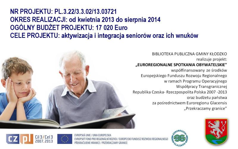 Z końcem sierpnia 2014 roku kończy się realizacja dwuletniego polsko-czeskiego projektu „Euroregionalne Spotkania Obywatelskie”. Zadanie jest współfinansowane ze środków Europejskiego Funduszu Rozwoju Regionalnego w ramach Programu Operacyjnego Współpracy Transgranicznej Republika Czeska-Rzeczpospolita Polska 2007-2013 oraz budżetu państwa za pośrednictwem Euroregionu Glacensis „Przekraczamy granice”. Jego realizatorem jest Biblioteka Publiczna Gminy Kłodzko.