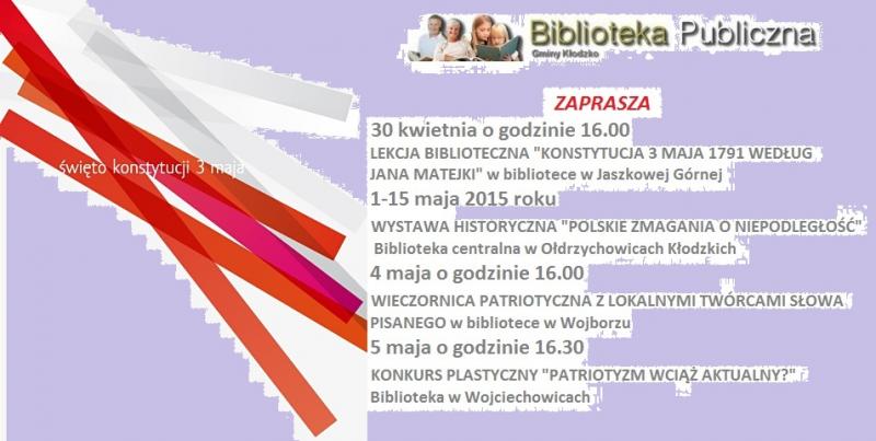 W dniu 30 kwietnia 2015 r. z okazji 224. rocznicy uchwalenia Konstytucji 3 Maja w Filii Biblioteki Publicznej Gminy Kłodzko w Jaszkowej Górnej odbyła się prelekcja i projekcja filmu, którą poprowadziła pani Agata Maślanka. Temat spotkania to Konstytucja 3 Maja oczyma Jana Matejki. Na podstawie obrazu Jana Matejki Konstytucja 3 Maja, prelegent omówił postaci znajdujące się na nim oraz jaki miały wpływ na powstanie dokumentu. Fascynująca edukacja historyczna!
