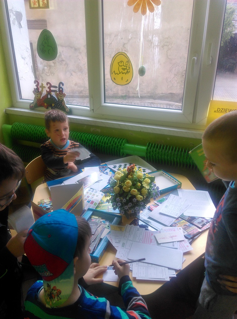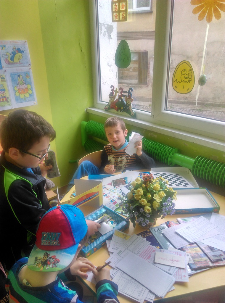 Na tym nie koniec. Dzieci sięgnęły po gry planszowe, a zabawa w Pocztę z pieniążkami była kolejną fajną frajdą. Pani wychowawczyni Małgorzata Wasilewska wraz z opiekunką Edytą Czwalińską miały pełne ręce bibliotecznej i pocztowej pracy…